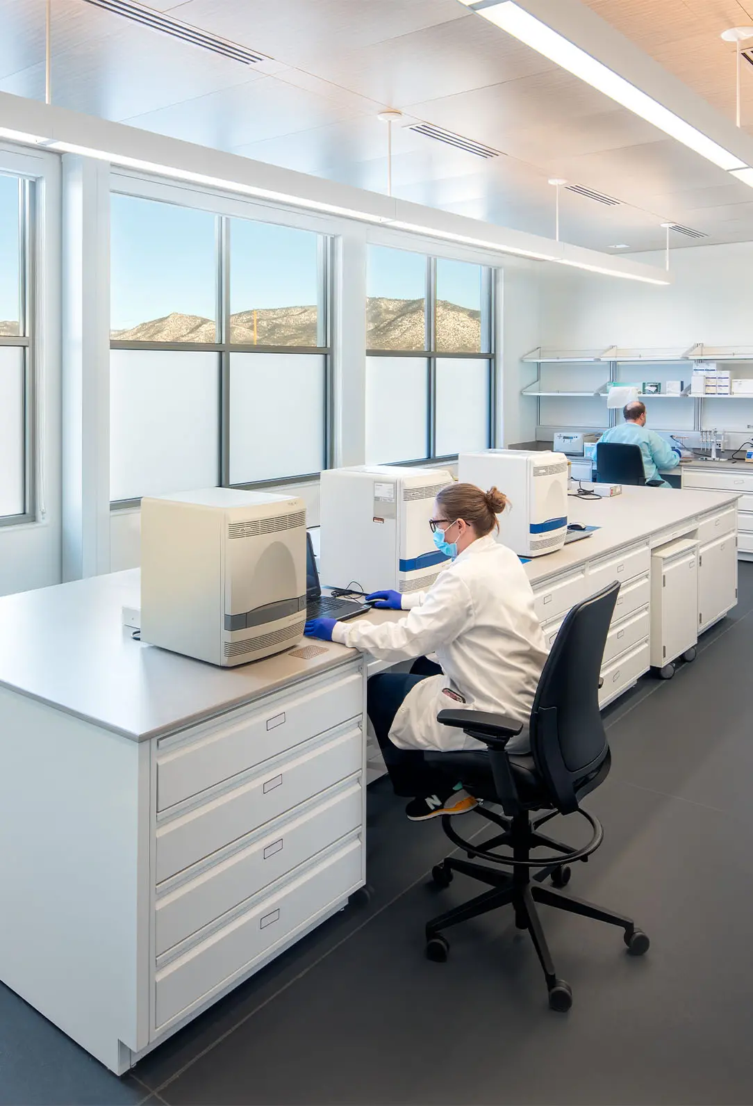 Modern scientific workplace design requires an interweaving of lab and office. For example, write-up space is heads-down, lab adjacent, and quiet—creating a fungible “lite lab” zone that, with the integration of mindful MEP systems, allows for adaptive change between office, computational lab, bench lab, and interaction area.