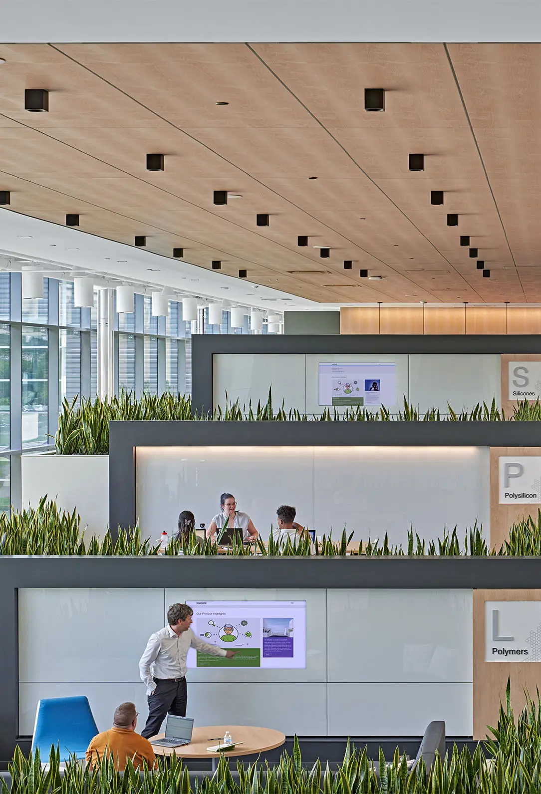 Integrating natural elements and exterior views into the research environment enhances the well-being and productivity of occupants. Natural light, greenery, and the use of natural materials address people’s innate need to connect with nature and therefore contribute to a more desirable and healthier workplace.