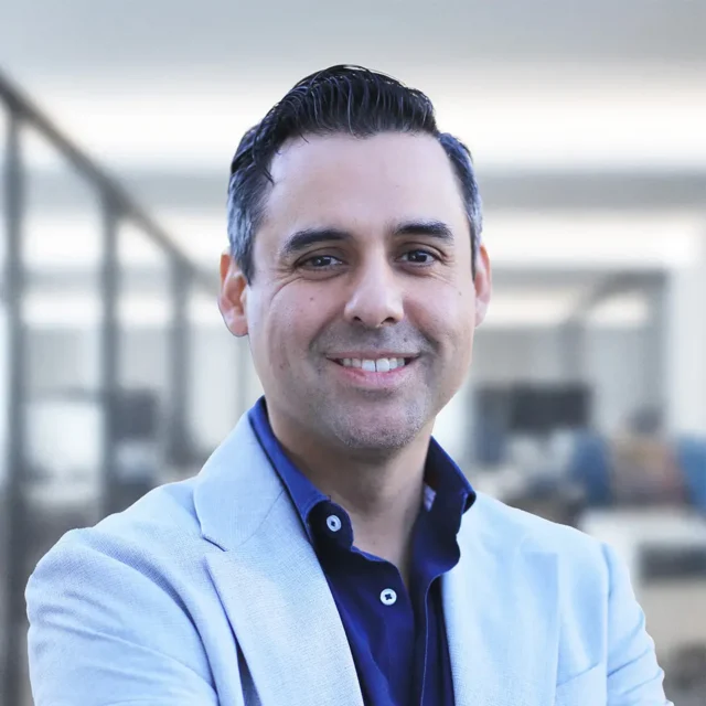 Business professional smiling in an office setting with blurred background.