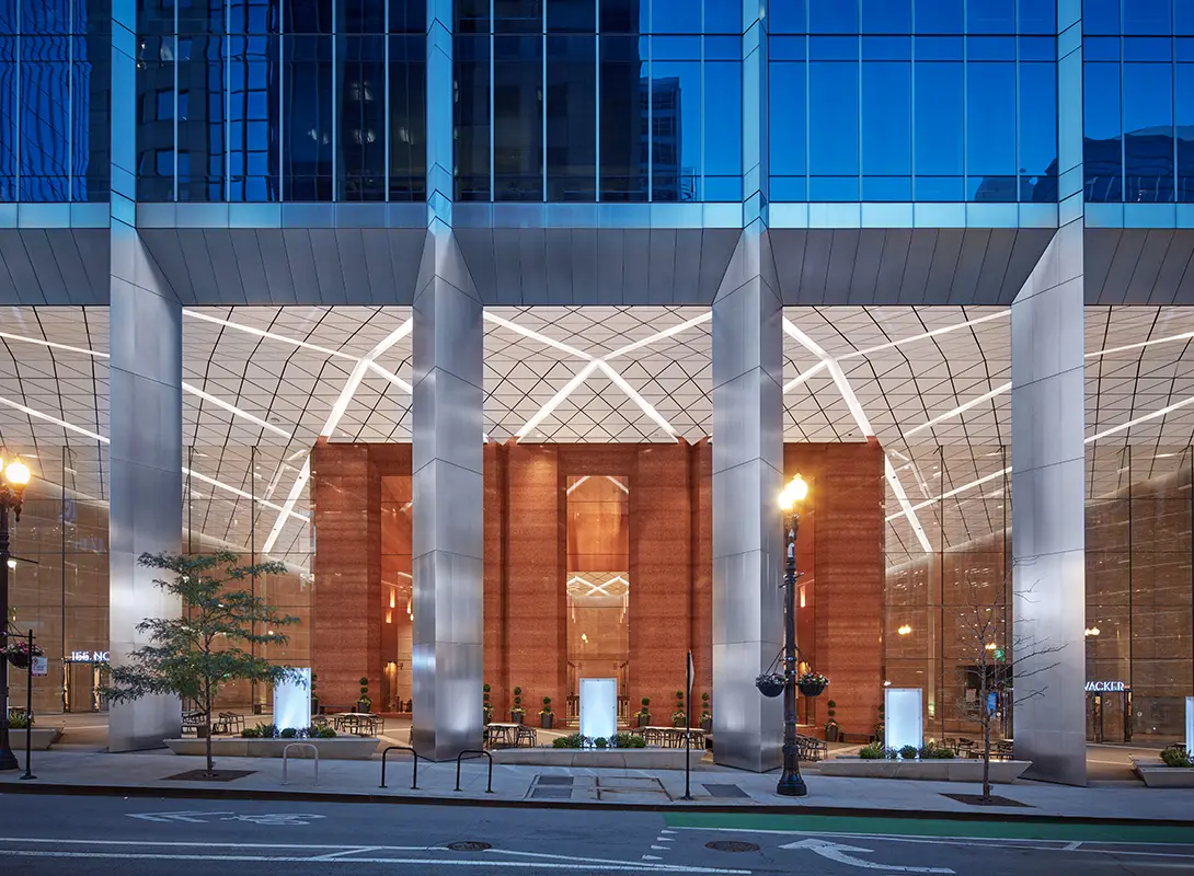 The renovation also allowed the owner to reconsider building signage. Working with HED’s experiential graphic design team, a strategy was developed to balance visibility with subtlety, ensuring that branding would complement rather than compete with the architecture. Custom dimensional polished metal signs, paired with razor-thin entrance portals, reflect the crystalline quality of the glass façade. At night, backlit signage enhances visibility along both Wacker Drive and Randolph Street while preserving the building’s minimal, transparent character.