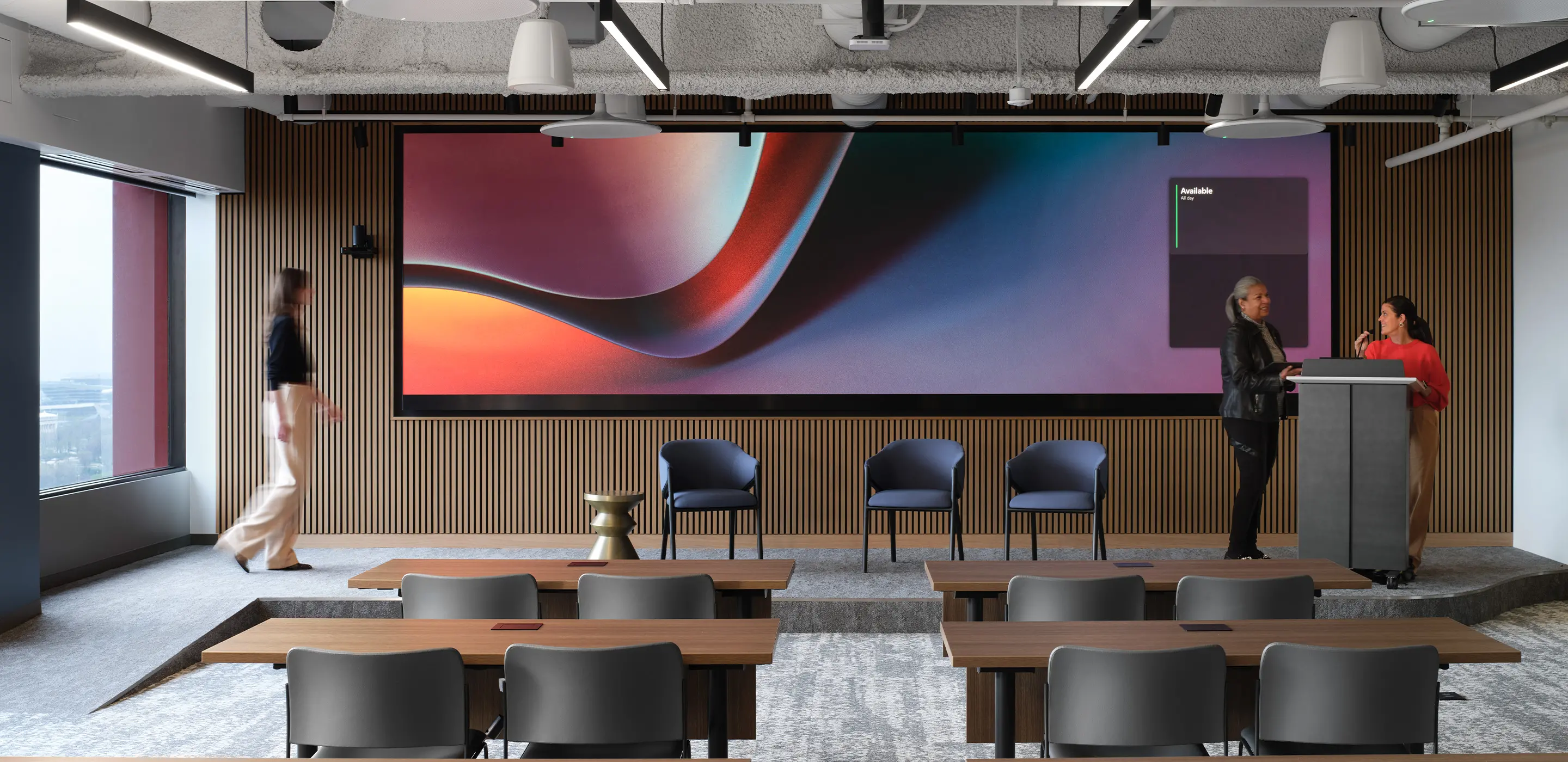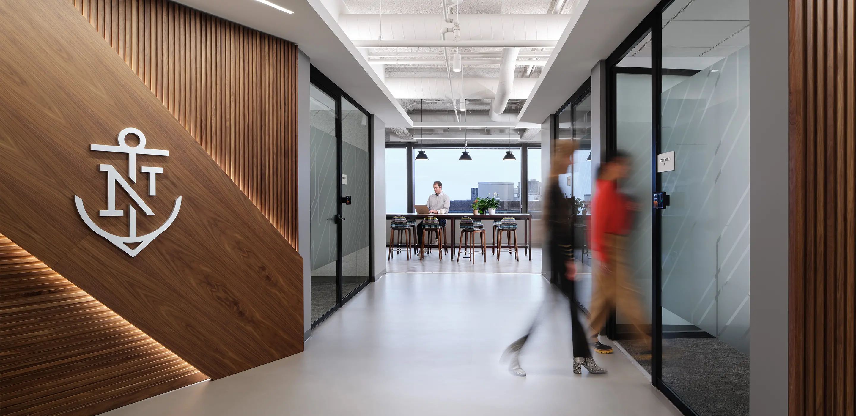 The design centers on creating a warm and professional environment that supports how Northern Trust’s Partners—its term for employees—connect, collaborate, and thrive. The arrival sequence sets the tone: a branded reception area and interview suite welcome candidates and visitors, presenting a confident first impression that communicates the company’s values and culture. Adjacent to this entry, a 75-person multipurpose room offers a dynamic setting for onboarding, training, and company-wide gatherings, reflecting Northern Trust’s ongoing investment in its people and culture of continuous learning.