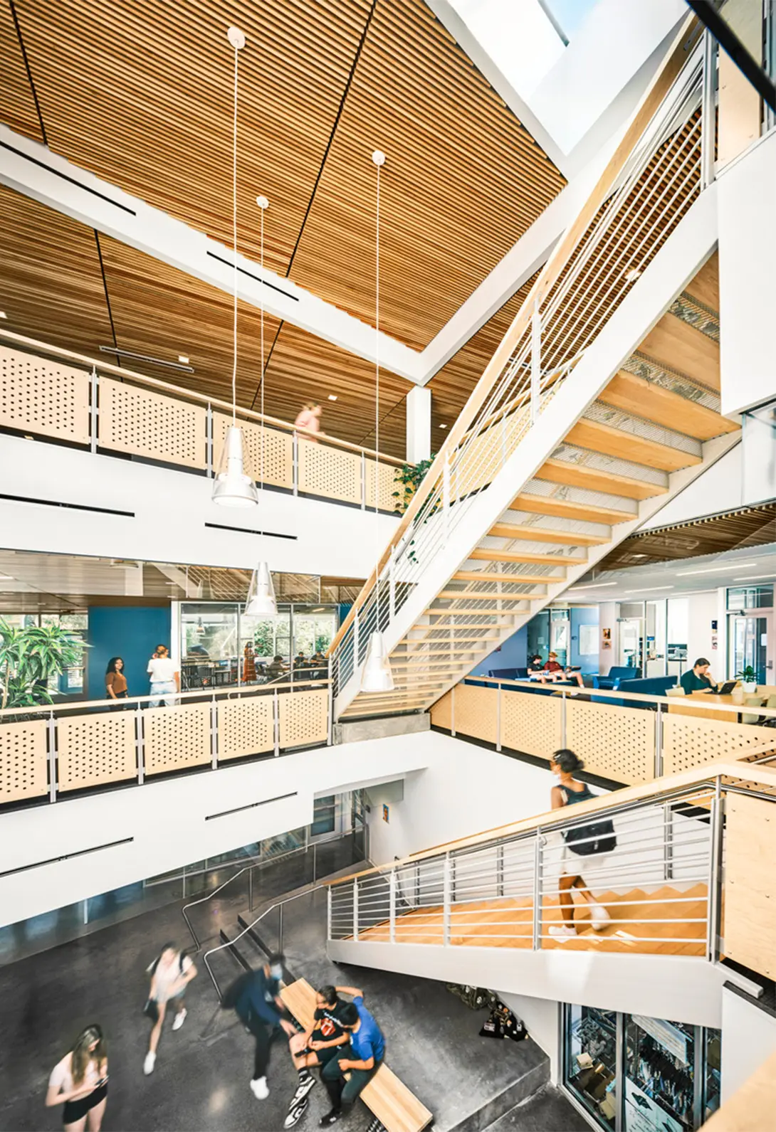 The building bridges more than academic programs. It physically connects the upper academic campus to the lower athletic fields through an exterior bridge and stair, enhancing circulation and reinforcing a sense of unity across the site.