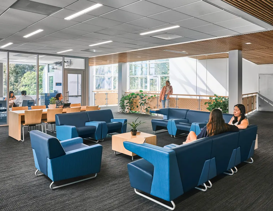 Sustainability also plays a defining role. Natural ventilation and abundant daylight reduce reliance on mechanical systems, while drought-resistant landscapes and the preservation of a heritage oak tree demonstrate thoughtful site stewardship. Photovoltaic panels on the roof and photovoltaic glass cladding on the west façade generate renewable power, with infrastructure in place for future expansion. These strategies make the Bachmann Collaboration Building not only a center for innovation in learning but also a model of environmental responsibility.
