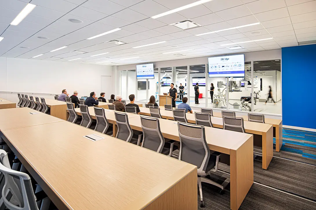 In an industrial building originally used as a biomedical distributorship, a vacant quarter of the facility offered an opportunity for reinvention. Zimmer Biomet, a global leader in musculoskeletal healthcare, sought to transform the empty warehouse-like environment into a sophisticated Bioskills Center—part surgical training facility, part product showroom, and part brand experience. To achieve this, the company partnered with HED to reimagine the raw space as a state-of-the-art destination for medical professionals.