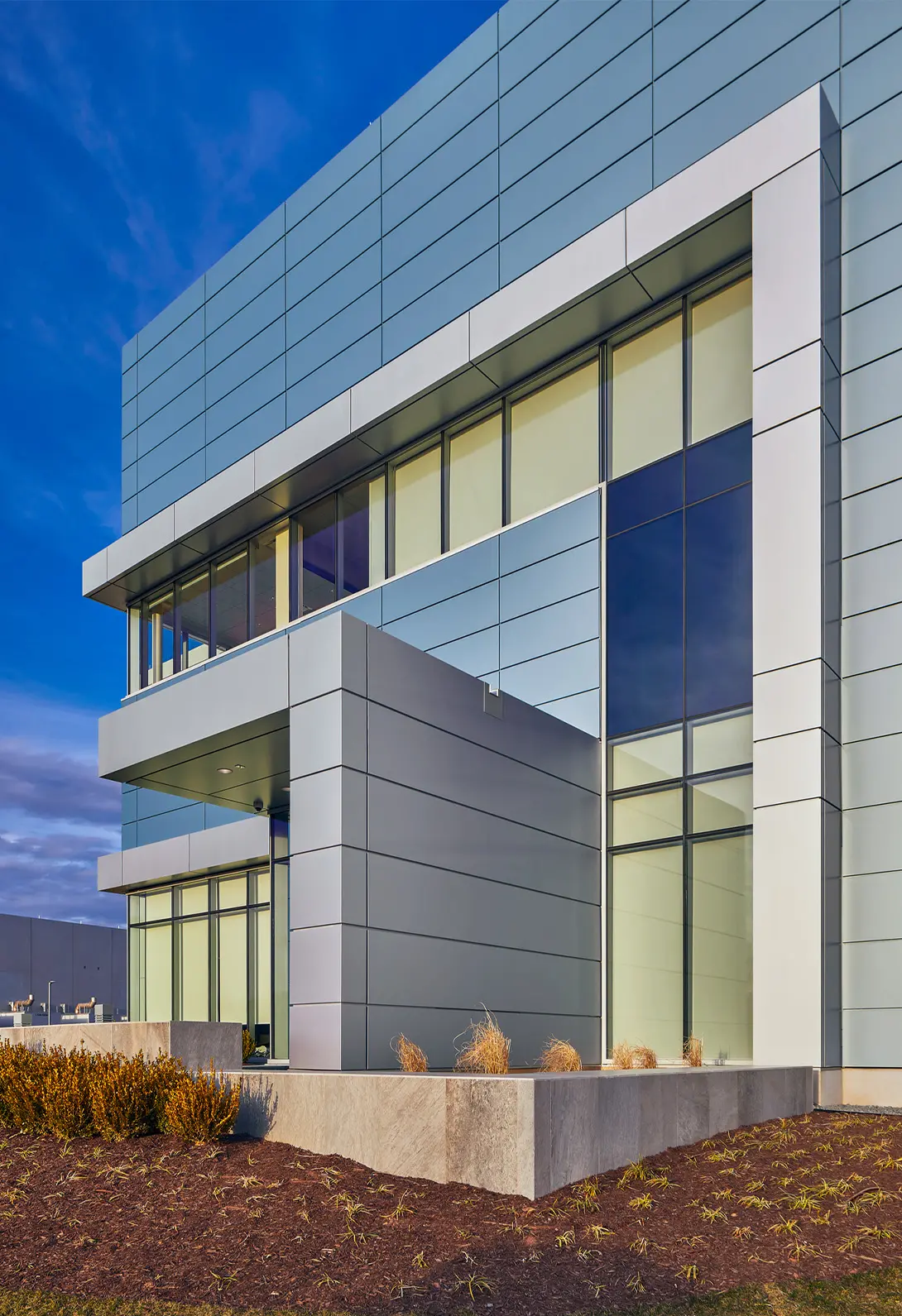The architectural design reflects the precision and consistency of Digital Realty’s brand. The building’s exterior mirrors its campus neighbors, maintaining a unified visual language while incorporating subtle refinements in detailing and proportion. Inside, the layout balances technical rigor with an elevated customer experience. The first floor includes tenant storage, offices, and client amenities, while the second floor features a 4,700-square-foot private office suite designed for operational and client use.