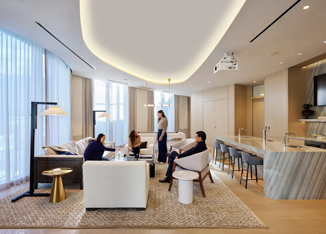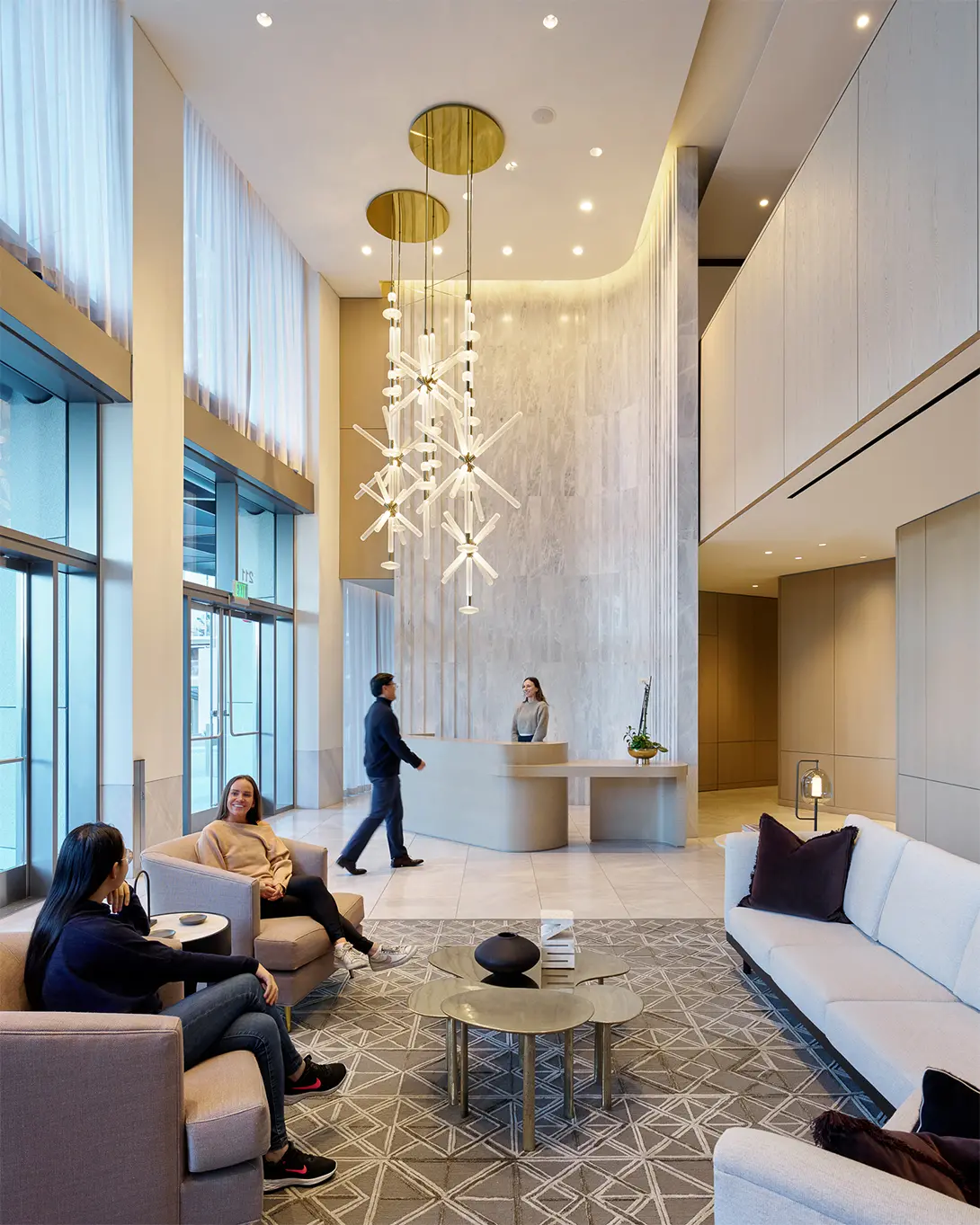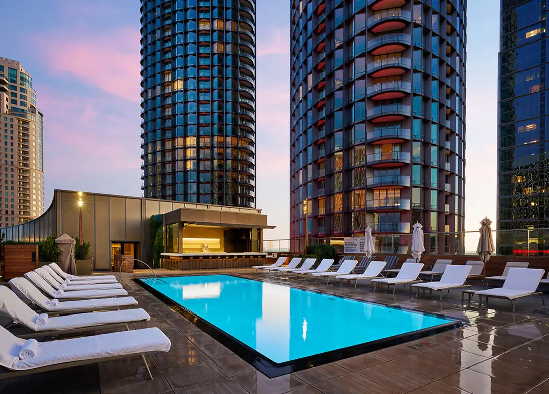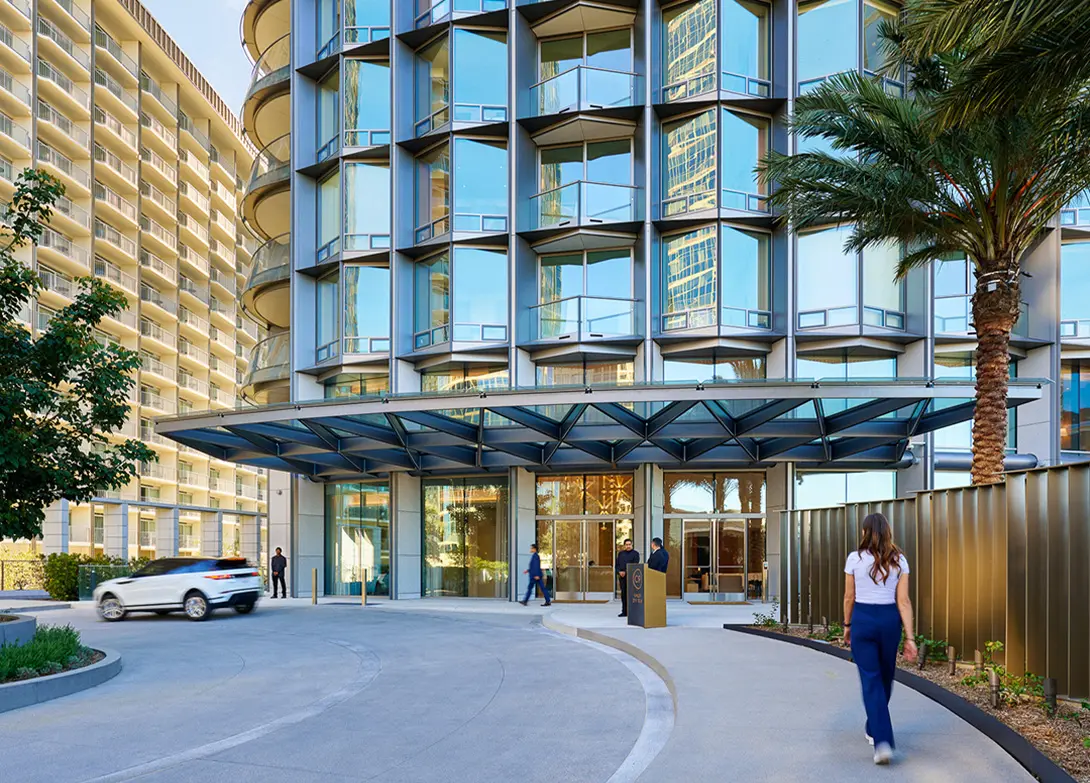 The new towers flank the hotel’s west elevation, establishing a striking architectural counterpoint while remaining part of a cohesive mixed-use development. Each tower rises from a six-level podium and parking structure, designed in collaboration with Gensler.