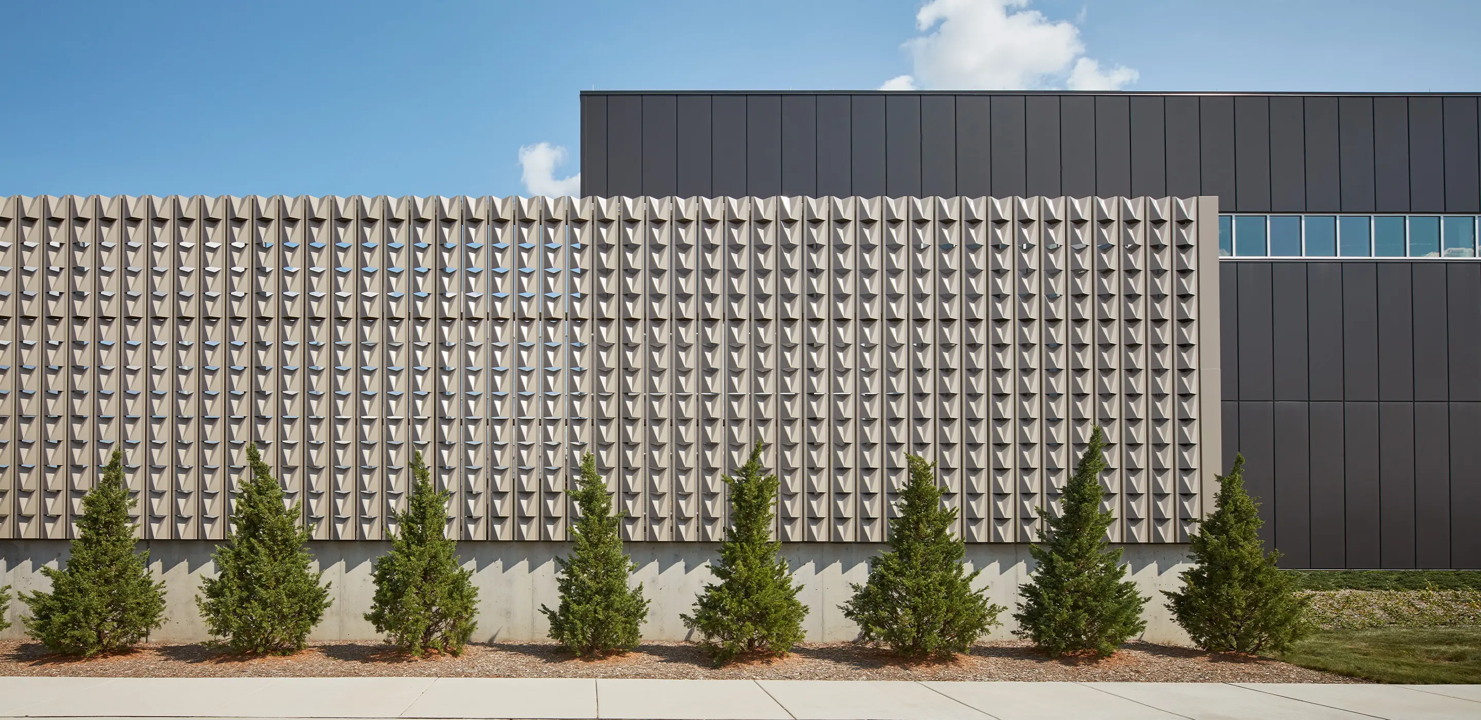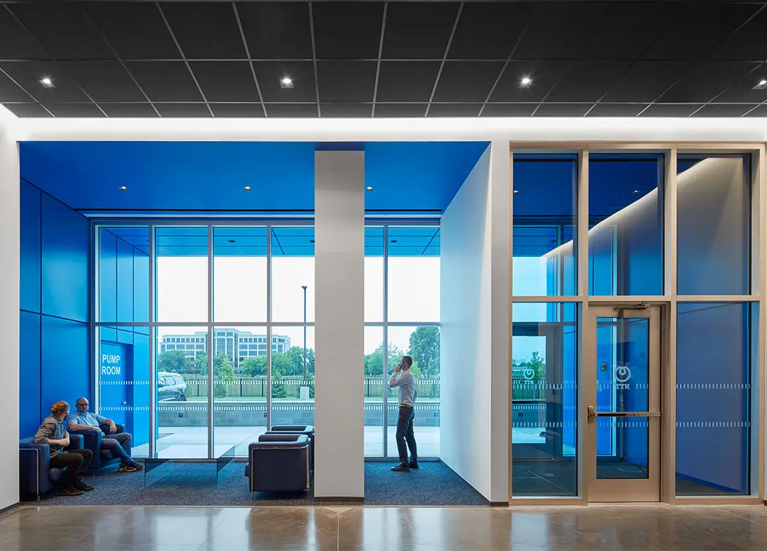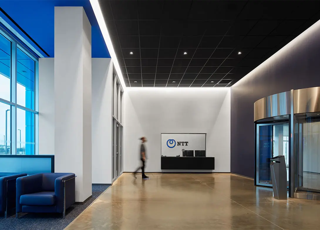 Context also shaped the design. Located in a prominent corporate office park, the Itasca facility was the first data center in its setting, and expectations for architectural quality were high. To meet this challenge, the design employs contrasting textures, patterns, and colors to add visual interest where visibility matters most. Distinctive elements—including a bold NTT-blue frame at the main entrance, blue-tinted curtainwall glass, striped stair towers, and patterned concrete—give the building a recognizable identity. These features have since become design standards across NTT Global Data Centers Americas projects, reinforcing a consistent brand image from Illinois to Arizona, California, and Oregon.