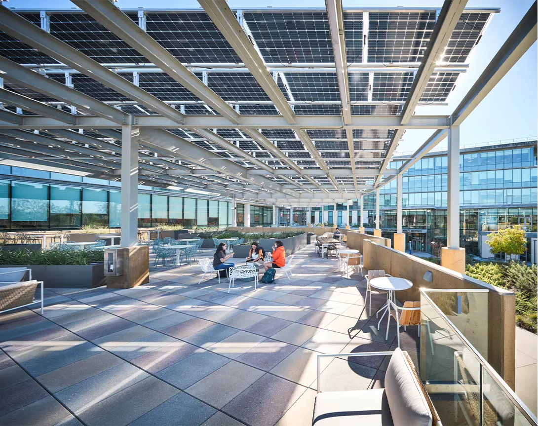 Integrator: Both buildings connect to a central courtyard, anchored by an auditorium that doubles as a gateway to campus and a resource for university-wide events. Outdoor pre-function spaces and roof terraces extend activity into the landscape, while a glass bridge connects wings, creating opportunities for collaboration and informal encounters among researchers, faculty, clinicians, and administrators.