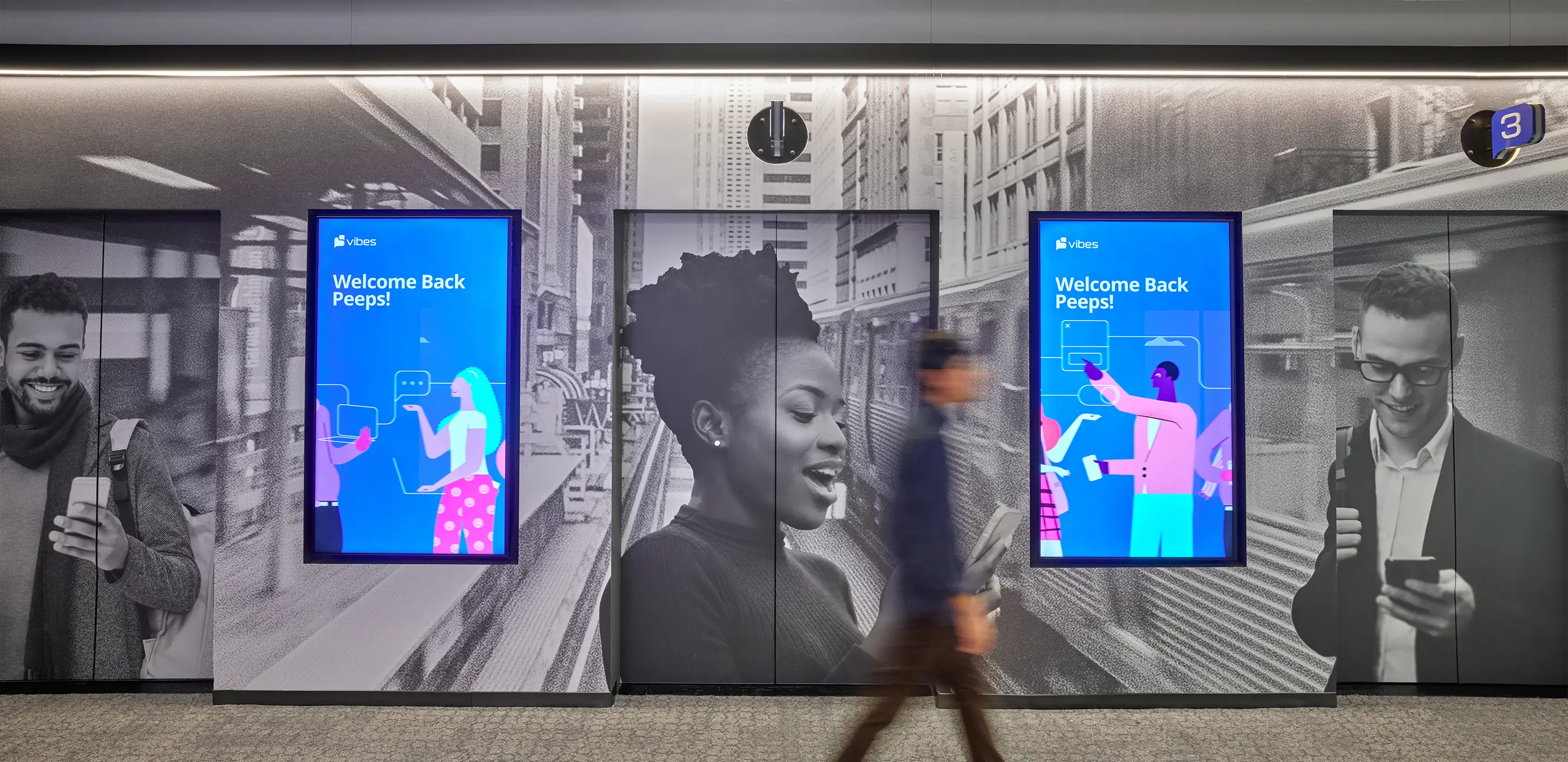 Experiential graphics became a unifying element, extending the brand beyond logos and colors into a fully immersive narrative. From the moment visitors step into the elevator lobby, they are greeted by floor-to-ceiling supergraphics that establish a clear sense of arrival and belonging. Custom elevator call lights add a playful, branded detail that reinforces identity at an intimate, tactile level. These visuals are intentional extensions of Vibes’ voice, scaled to architectural proportions.
