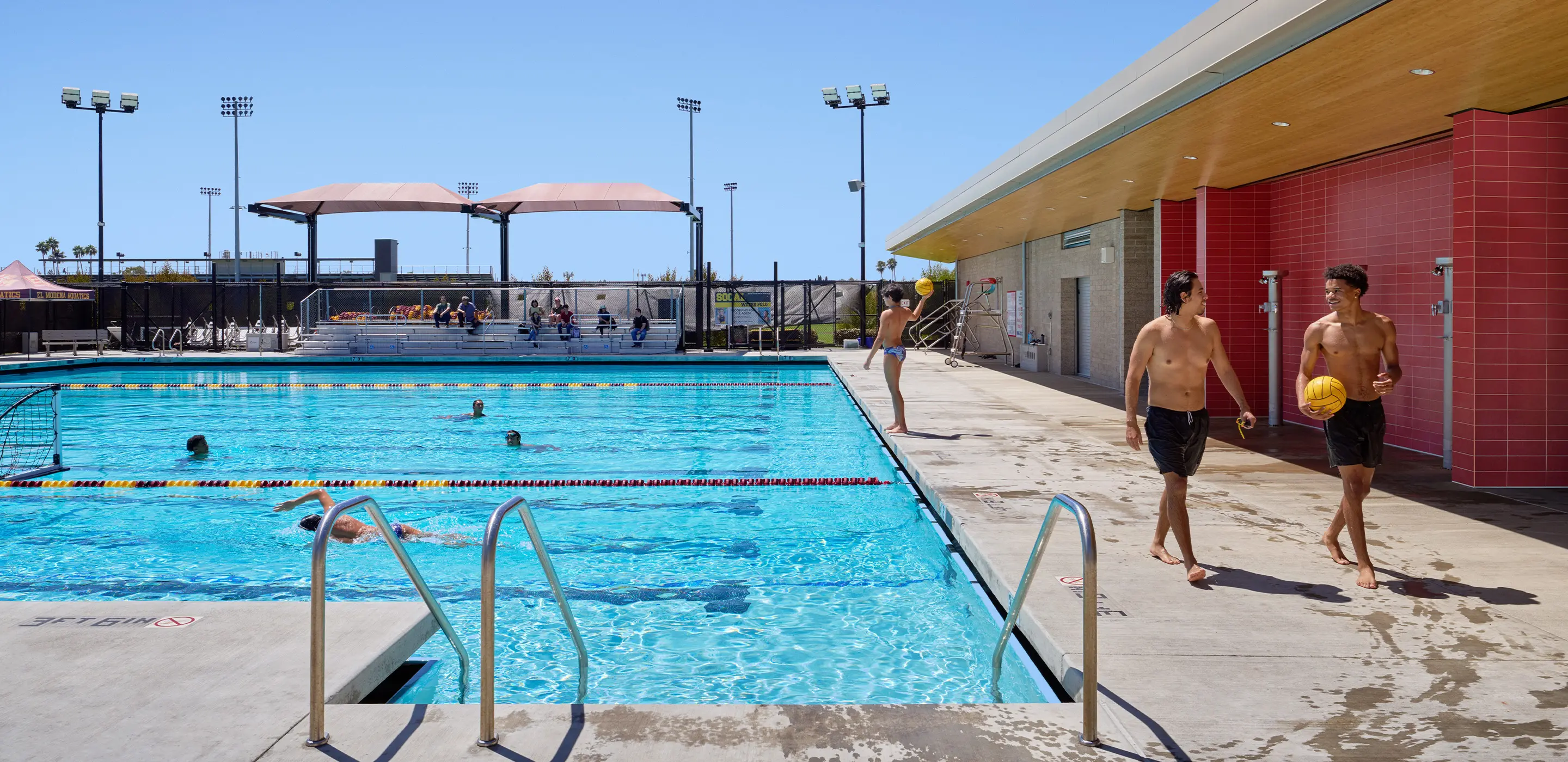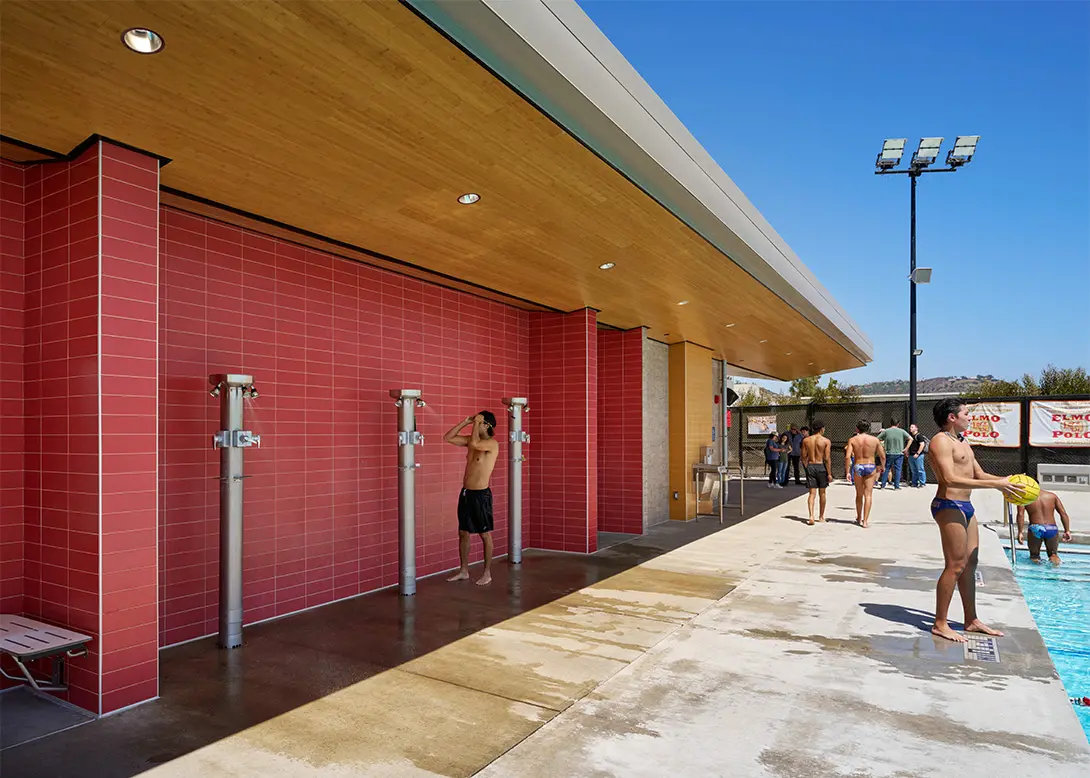 The surrounding deck was carefully planned to maximize usability within the original footprint. Shade canopies cover the bleachers, providing comfort for spectators during long events under the California sun. LED lighting illuminates both deck and pool with energy-efficient, glare-controlled precision, supporting evening competitions while reducing operational costs. Heated outdoor showers, new locker rooms, and four restroom facilities expand amenities for both students and visiting teams. Storage, a training area, and a snack bar further support the versatility of the space.