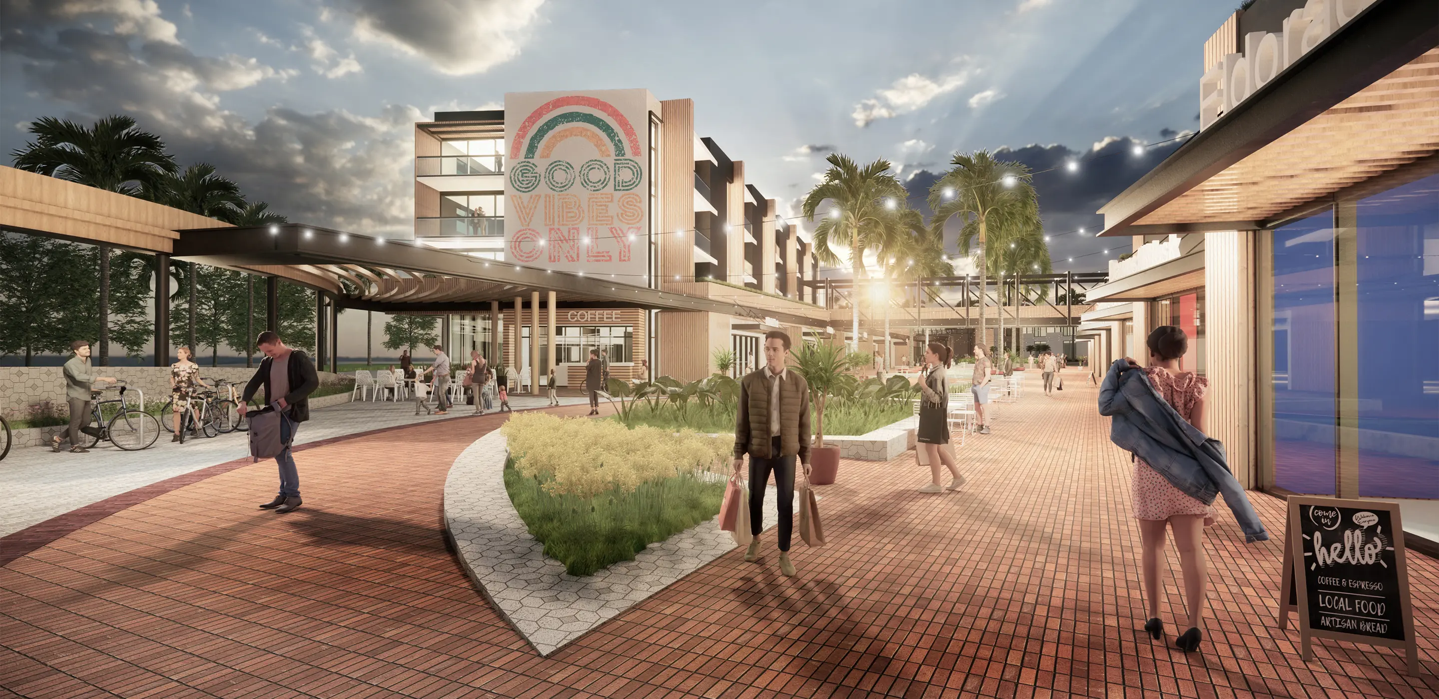 Balancing physical, social, environmental, and experiential factors was central to the design vision. Residential and commercial functions were layered to create a dynamic mix of uses, ensuring activity throughout the day and evening. Ground-floor retail spaces were designed to activate street edges, providing restaurants, shops, and services that would draw both residents and the broader community. Upper-level offices and residences added density and vitality, transforming the site into a true neighborhood rather than a stand-alone retail center.