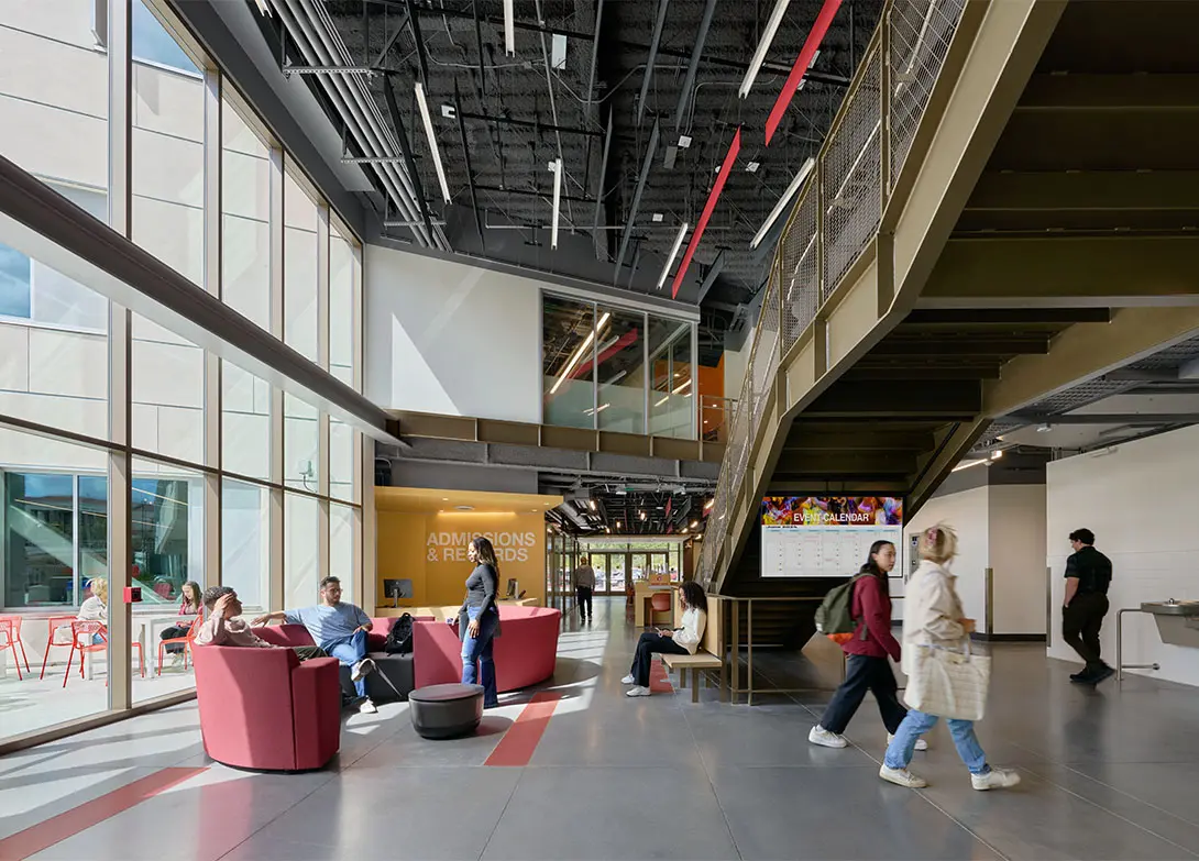 Within the building, an interior “Main Street” serves as the organizing spine. This wide circulation corridor doubles as a second path to the upper quad, offering direct access to student support services, administrative offices, and flexible facilities. Along its length, glazing and transparency showcase activities within, creating a lively “see and be seen” atmosphere. This openness makes services more visible and approachable, encouraging students to take advantage of the resources available to them.