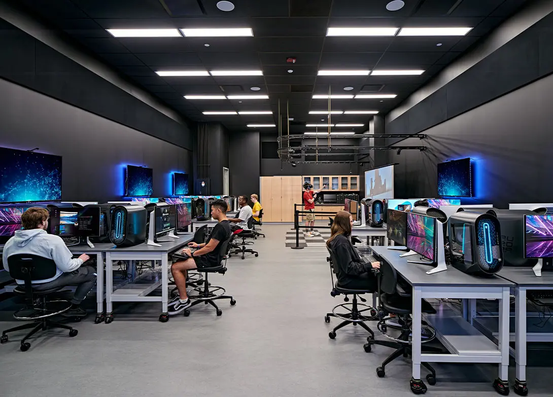 A modular lab footprint enhances flexibility across disciplines, while exposed ceilings in the centralized maker hub put building systems on display, turning infrastructure into part of the teaching toolset. Strategic glass placement reduces energy usage while preserving daylight and views, underscoring the university’s commitment to sustainability.