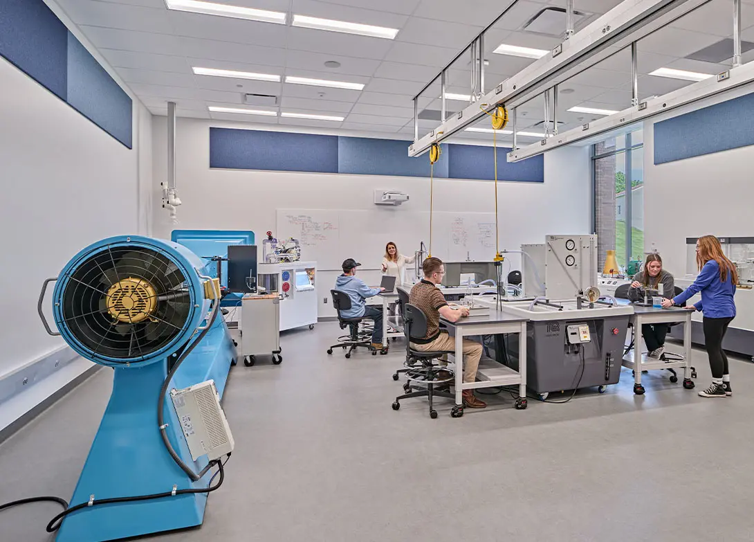 The Duke Building is designed as the centerpiece of technology education on campus. Within its walls, students gain hands-on experience in labs that replicate real-world engineering environments.