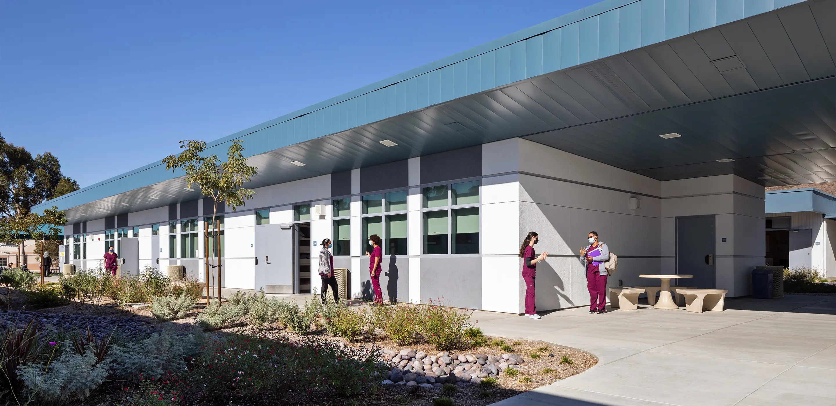 The buildings were carefully designed to integrate with the existing campus context. Their scale aligns with surrounding structures, occupying the footprint of the prior modulars while providing significantly enhanced durability and presence. Architectural features such as low profiles, deep overhangs, and exterior breezeways connect the buildings to the landscape, while abundant windows bring daylight into classrooms and labs. These design strategies promote comfort, reduce reliance on artificial lighting, and strengthen the connection between learners and their environment.