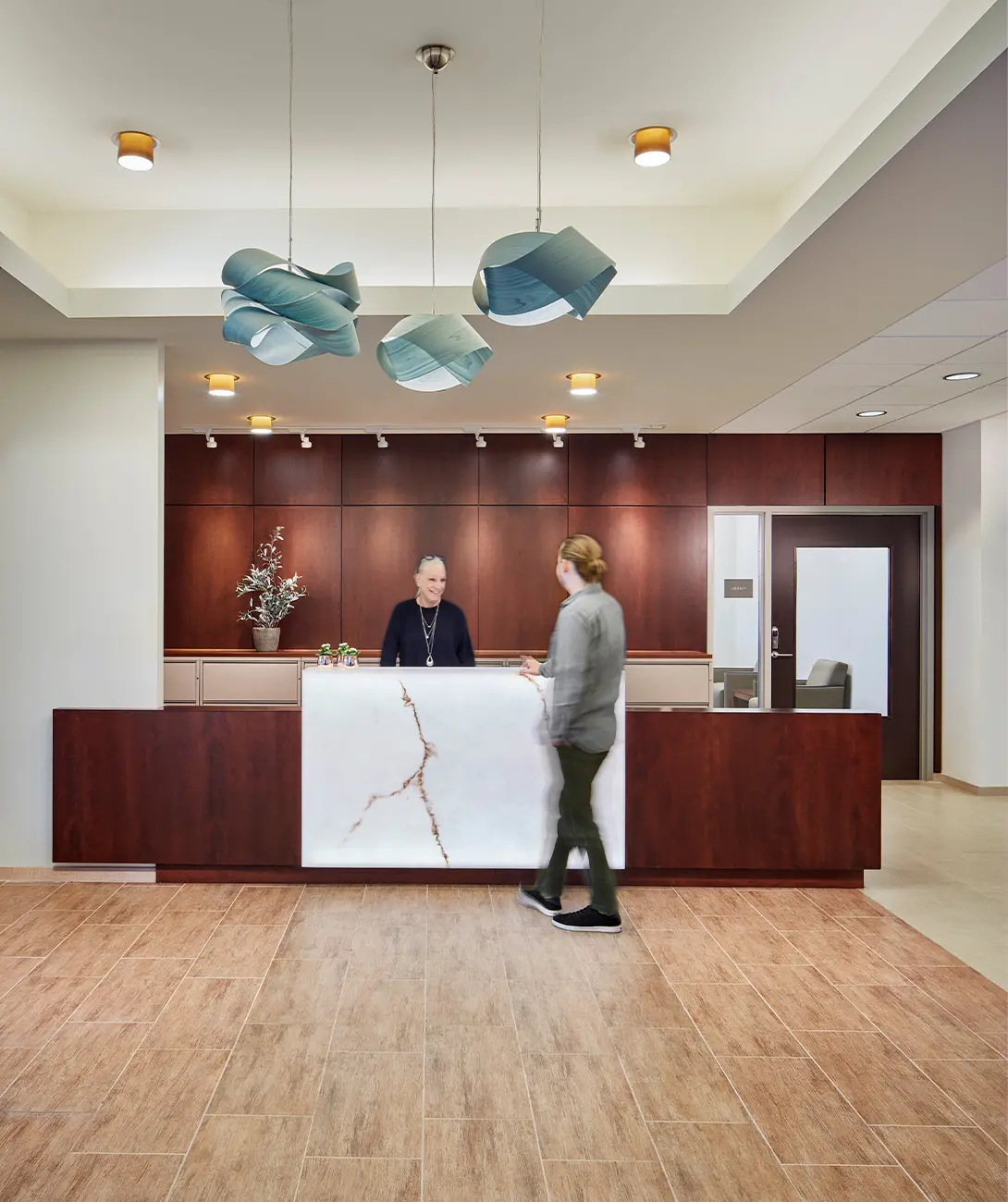 At 200 beds, the facility demonstrates how the “small house” model can be applied successfully at scale. Rather than organizing residents into long corridors of rooms, each floor is subdivided into four distinct households, each with its own sense of identity and community. This arrangement supports smaller, more personal environments that foster social connections and comfort while still meeting operational demands.