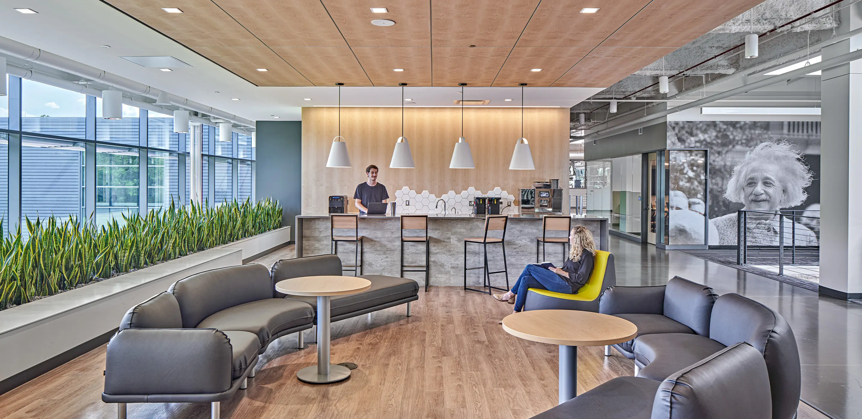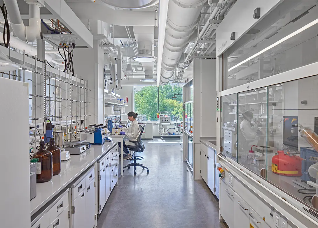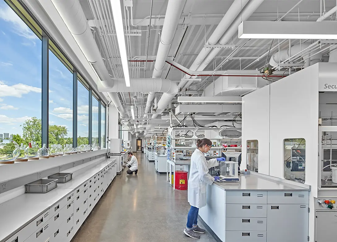 Large contiguous floor plates house both open office and laboratory areas, encouraging interaction and adaptability. Research labs are designed for flexibility, able to shift as new tools, processes, and priorities emerge. Workstations and collaboration zones flow seamlessly, creating opportunities for planned and spontaneous teamwork. Shared amenities—including dining, gathering areas, and informal meeting spaces—strengthen community while still allowing individual business units to retain their own identities.