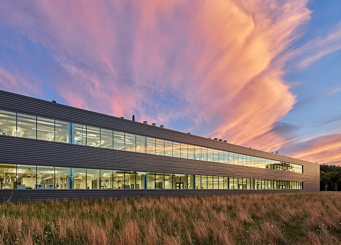 The resulting 165,000-square-foot building embodies what Wacker calls an “extroverted design.” Long north- and south-facing glass facades are oriented to maximize daylight and open views of adjacent wetlands and the broader community. The transparency of these walls allows employees, visitors, and even passersby to see the energy of research and collaboration inside, reinforcing the idea that the Innovation Center is not an isolated lab but a place deeply connected to its context.