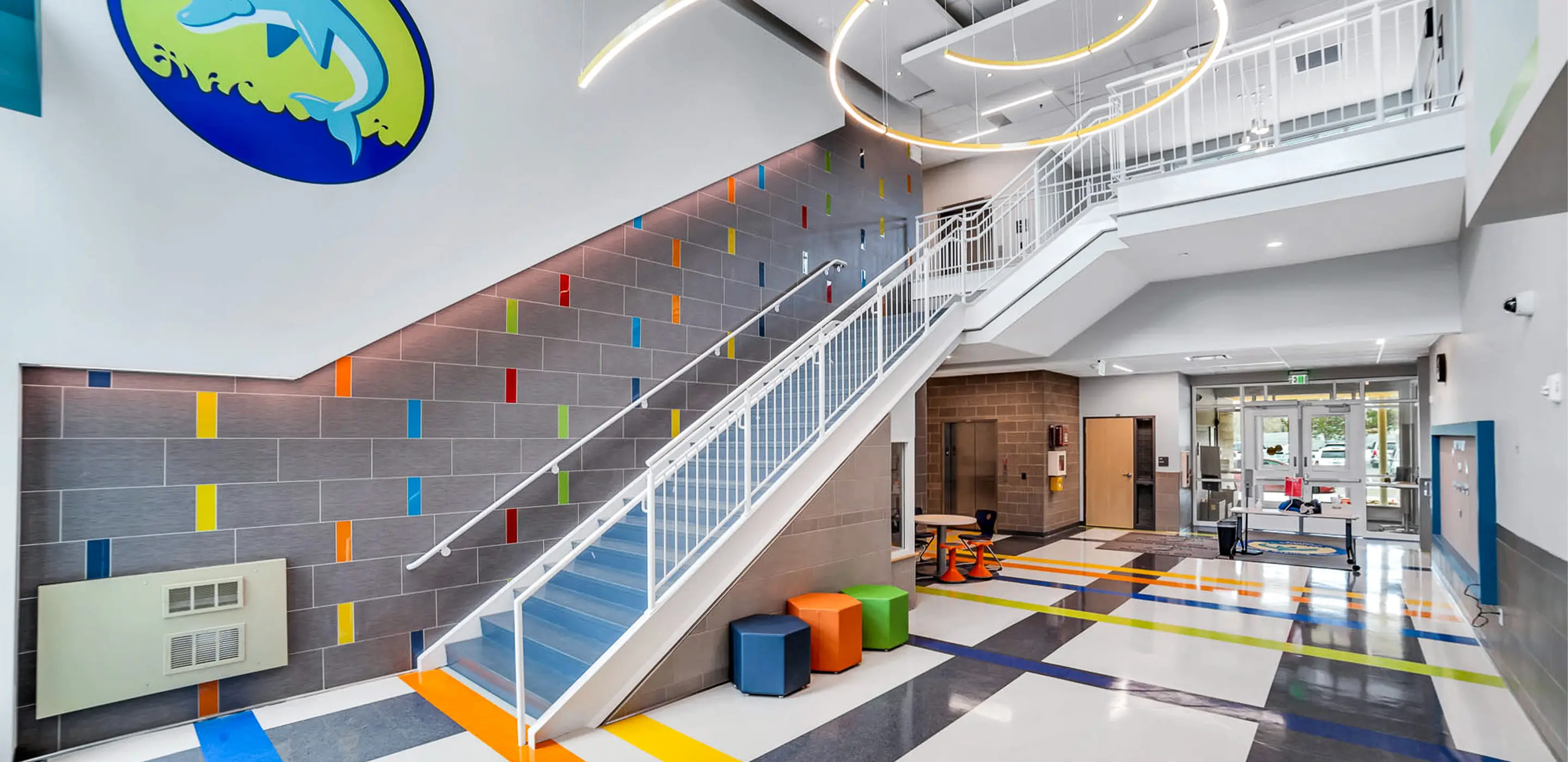 Kendrick Lakes Elementary has been reimagined as a vibrant, next-generation school designed to support 435 PK–5 students. Built on the same site as the original school, the new building replaces outdated infrastructure with an environment that emphasizes flexibility, collaboration, and strong connections to the outdoors. With bright, open spaces and abundant natural light, it provides an inspiring setting where learning and play flow seamlessly together.