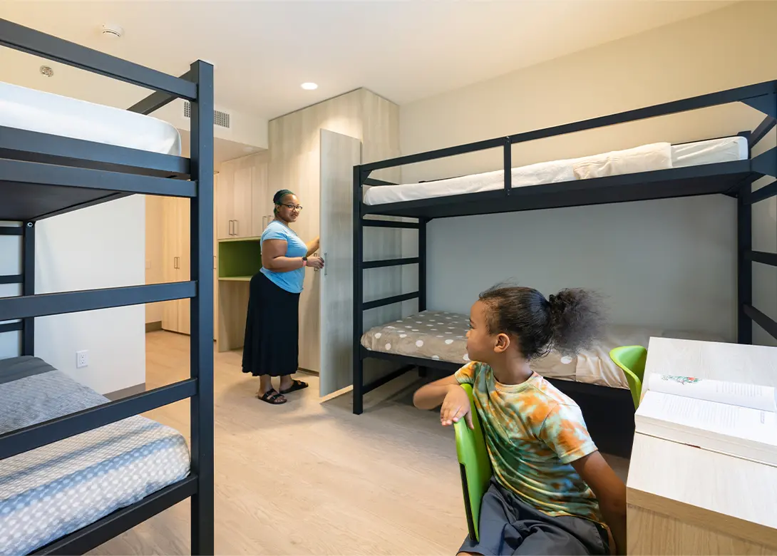 The guiding principle of the project was to move beyond the institutional feel that too often characterizes shelter housing. Rather than adopting a dormitory model, HED designed Angeles House to feel like home. Each of the 86 units offers private bathrooms, built-in storage, functional furnishings, and abundant natural light. Acoustic and visual privacy was prioritized, empowering families to feel safe and respected as they begin rebuilding their lives. This shift from dorm-style living to private, self-contained units is central to restoring dignity for residents and helping them regain a sense of stability.