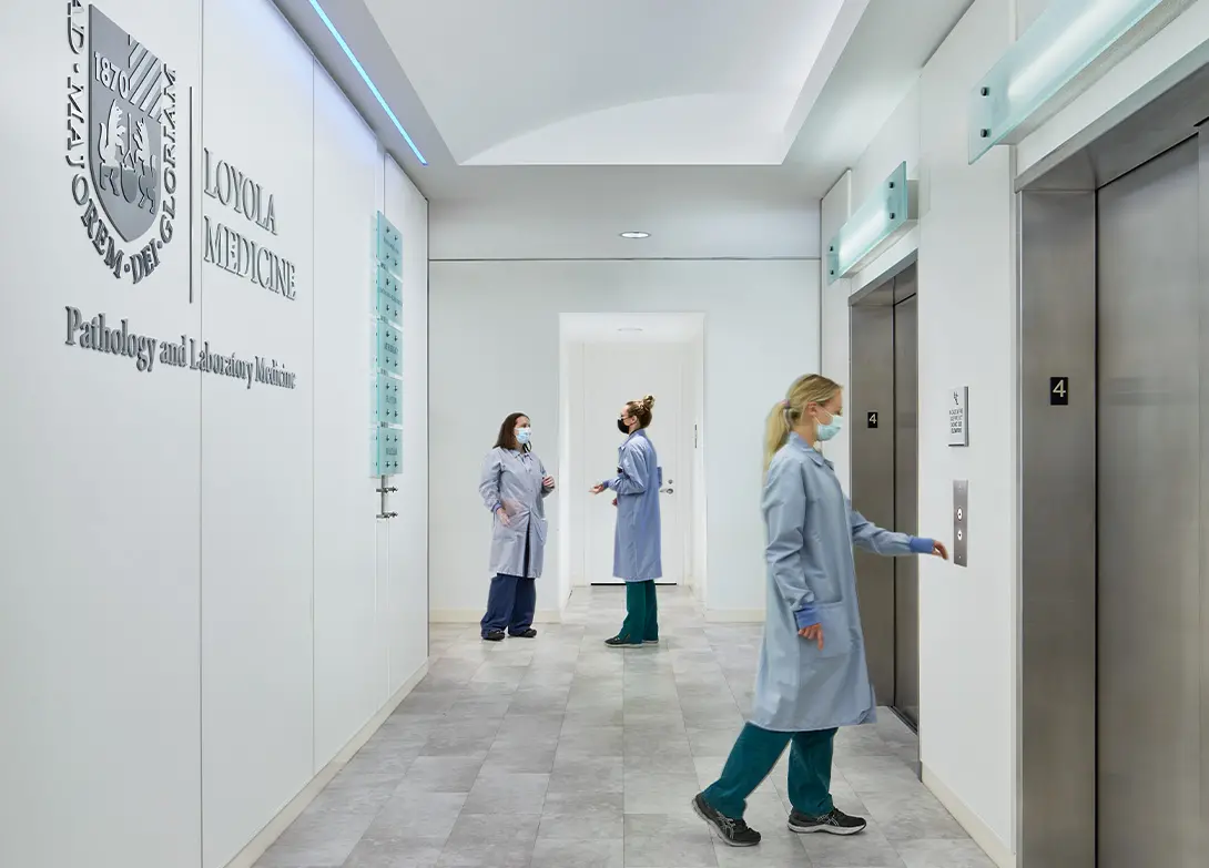 The result is a pristine laboratory spanning the fourth and fifth floors of the Emergency Medical Services building on Loyola’s Maywood campus. By uniting services under one roof, the new lab provides an open, flexible environment designed to support more than 2.5 million billable inpatient and outpatient procedures annually. Administrative functions were strategically located adjacent to the open lab to further streamline specimen processing and improve communication between staff.