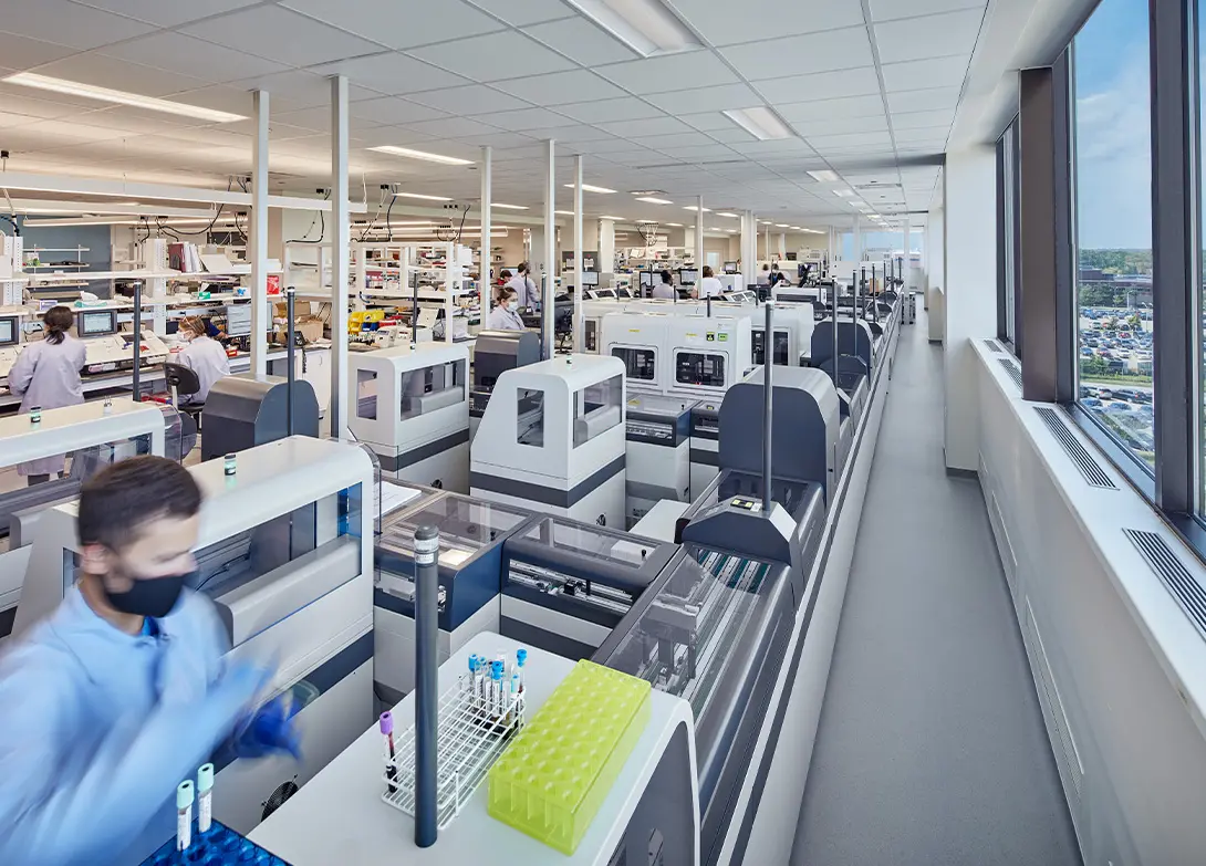 HED worked closely with Loyola Medicine to rethink lab operations from the ground up. Together, the team focused on optimizing workflows, improving efficiency, and planning for long-term growth, including the integration of emerging technologies and advanced testing methodologies. A major feature of the renovation was the installation of an automated line on the fifth floor, dramatically improving throughput while enhancing both the accuracy and efficiency of specimen testing.