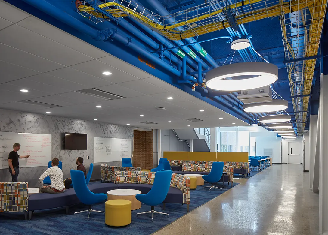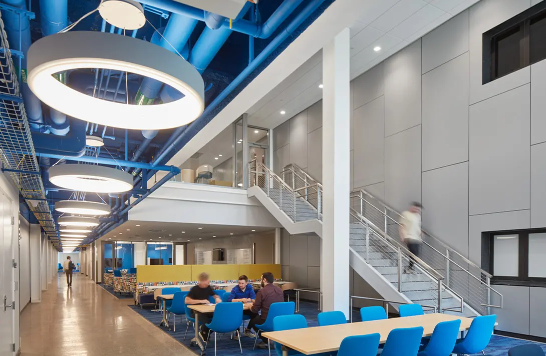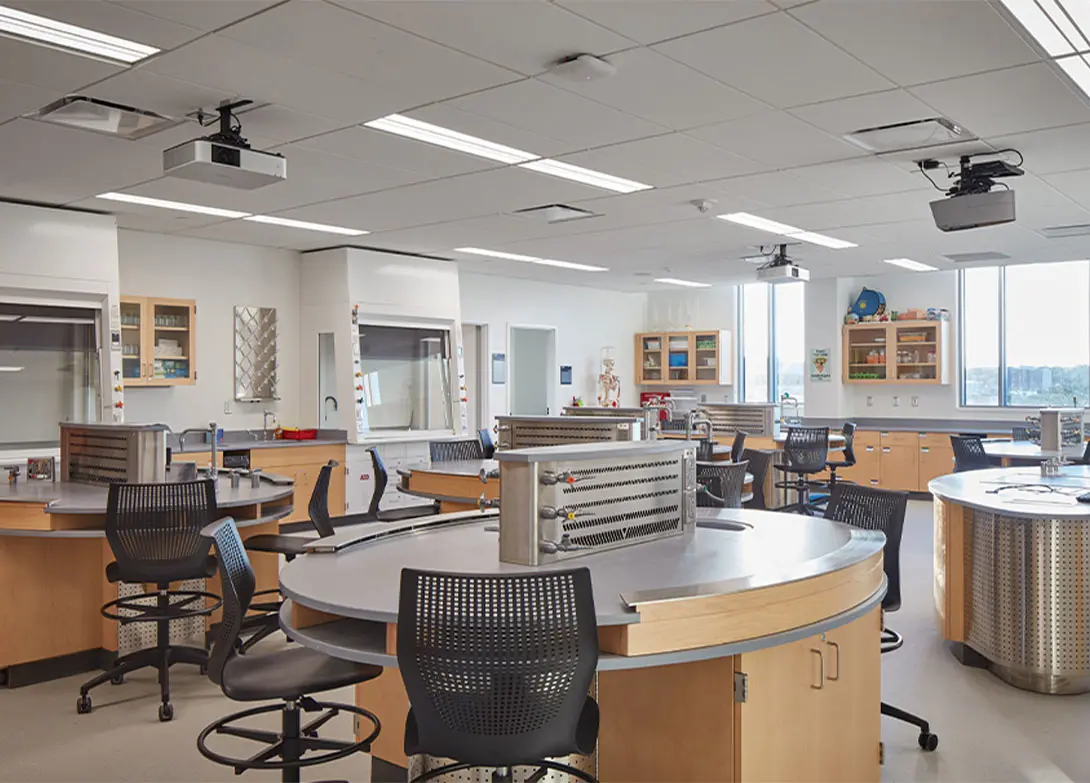 Spread across four stories, the addition introduces a wide range of specialized environments. A soaring high-bay laboratory supports vibration and automotive experiments, while new wet labs serve bioscience and chemistry. Engineering labs add further flexibility for research and applied study. At the center of the third floor, a suite of large, general-purpose classrooms consolidates learning across disciplines. By drawing students from every STEM field into a shared academic core, the design prevents silos and sparks opportunities for cross-disciplinary discovery.