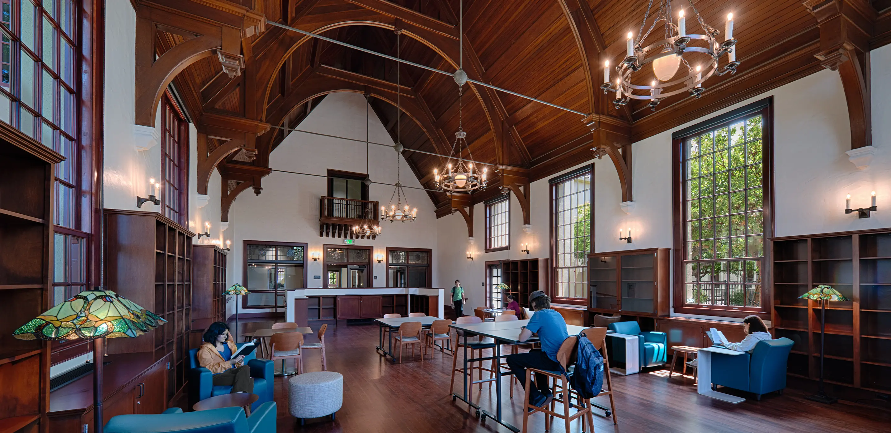 At the heart of the project was the renovation of the building’s historic meeting room. Once a soaring, double-height space with a vaulted wood ceiling and built-in casework, it had long been compromised by cubicles, carpeted floors, and infill partitions. HED’s modernization recaptured the room’s original grandeur by stripping away later alterations, refinishing the plank flooring, and restoring the original wood detailing. Even the historic light fixtures—irreplaceable features of the space—were custom retrofitted to allow them to remain in use. The result is a central gathering room that once again supports collaboration and ceremony while reflecting the school’s history.