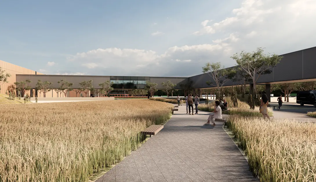 The surrounding landscape was conceived as an extension of this sustainable approach. A linear butterfly garden and natural pollinator zones weave through the campus, planted with native species and vegetation recovered directly from the site. Irrigation relies entirely on grey water produced by facility operations, eliminating the need for potable water. These strategies create an outdoor environment that is restorative for workers while also strengthening local biodiversity.