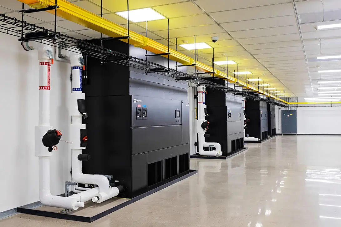 On the power side, the design introduced a scalable diesel generator plant with an ultimate capacity of 6 MW, paired with a distributed redundant UPS system scalable to 4 MW. Together, these systems provide resilient, flexible power distribution to critical IT loads while supporting continuous uptime. A new building automation system and electrical power monitoring system provide comprehensive visibility into mechanical and electrical operations, allowing the operator to track performance, manage efficiency, and monitor power usage effectiveness (PUE).