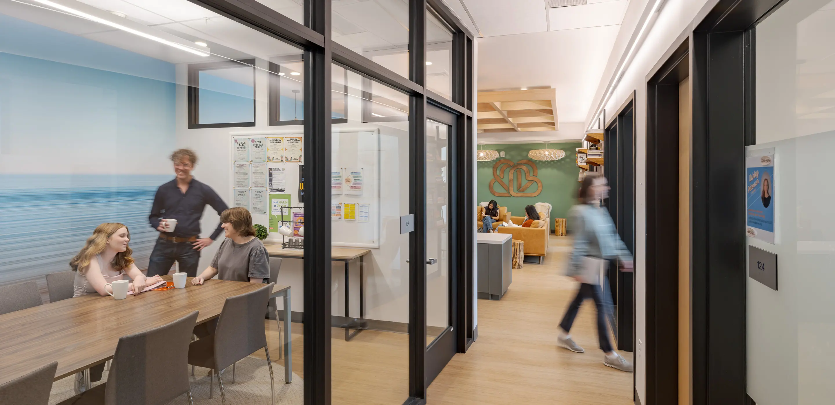 The design also incorporates principles of ecotherapy: the understanding that interaction with nature can positively influence wellness and healing. This philosophy guided decisions about lighting, color, and furnishings. Ample natural light is invited into spaces to reduce stress and improve mood. Soft, indirect lighting strategies complement this daylight, avoiding the harshness often associated with institutional environments. Furnishings are comfortable and approachable, contributing to the overall sense of calm.
