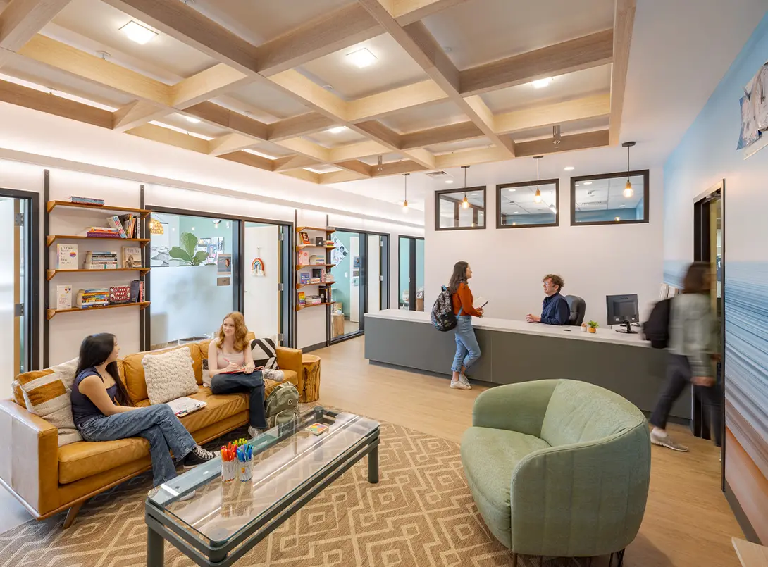 The design emphasizes warmth and comfort, making the Wellness Center not only functional but also restorative. Counseling spaces are carefully arranged to balance privacy and accessibility, creating a sense of security while encouraging students to reach out for help. Material and color choices were central to this effort. Drawing inspiration from nature, the palette uses warm tones, textures, and natural finishes to create a calming backdrop for healing and conversation.