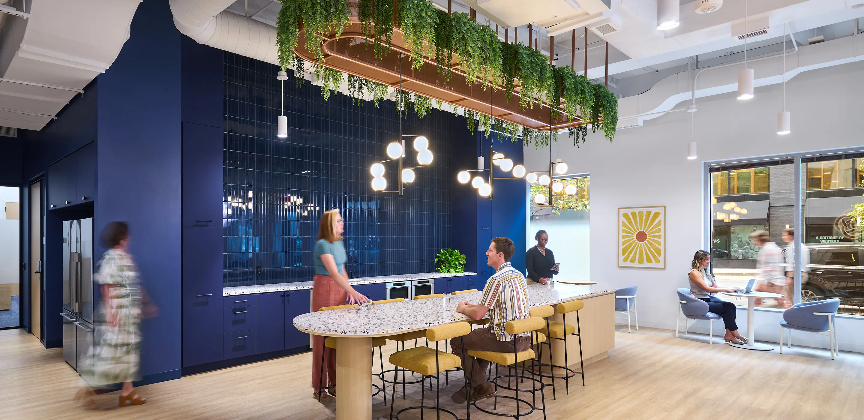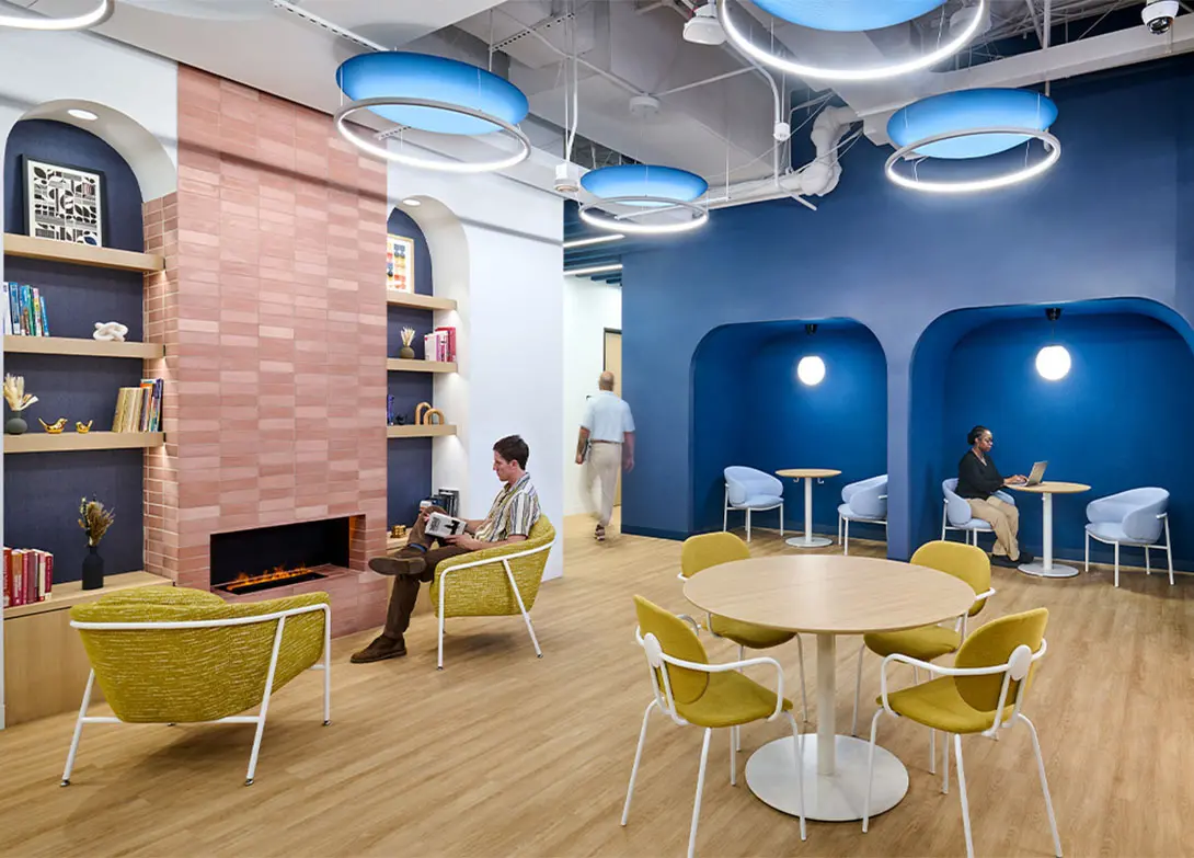 Lighting design plays an equally important role. Carefully selected fixtures enhance the ambiance, highlight architectural details, and contribute to noise mitigation throughout the space. The result is an interior experience that balances energy with calmness, supporting both focused work and social engagement.
