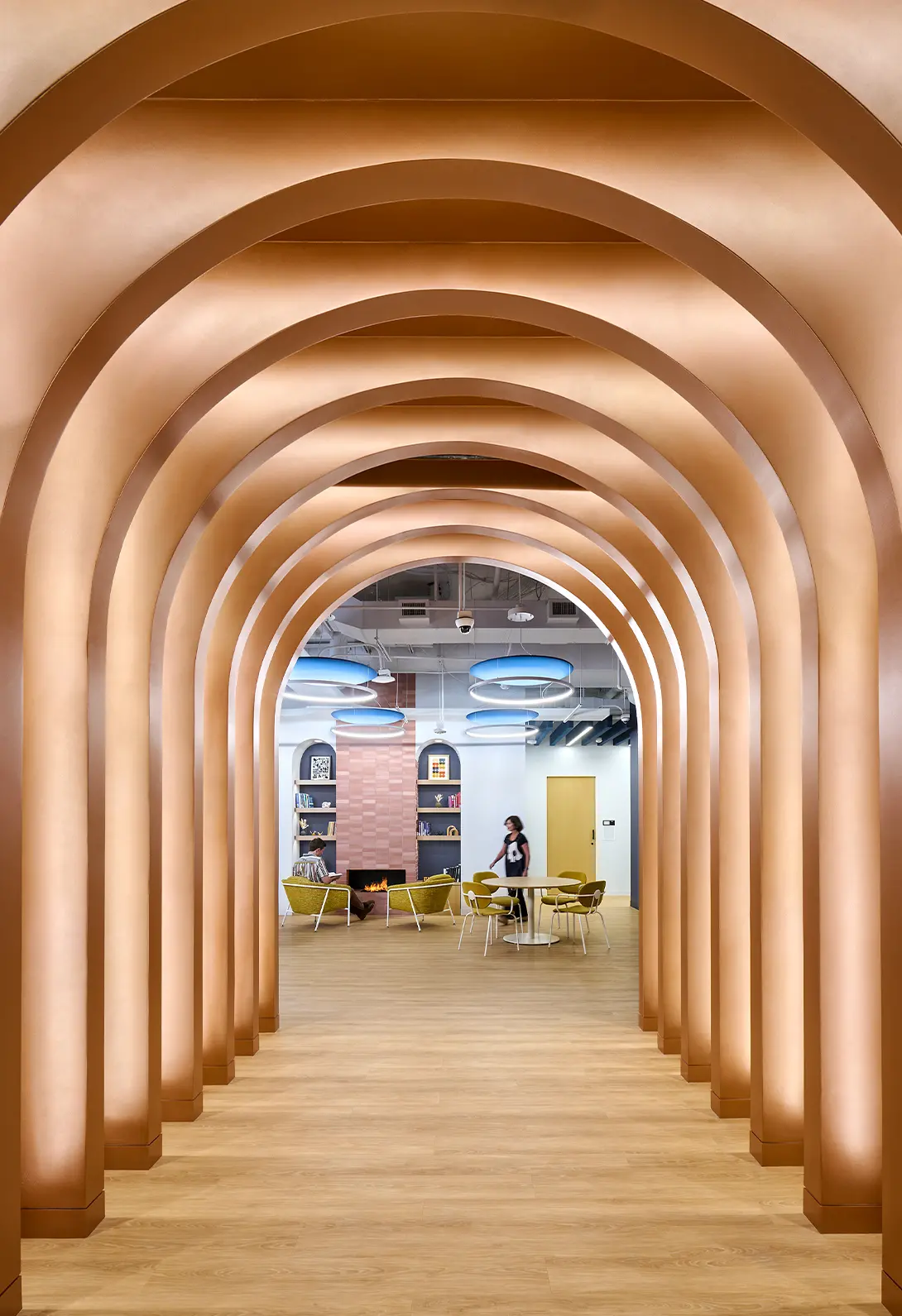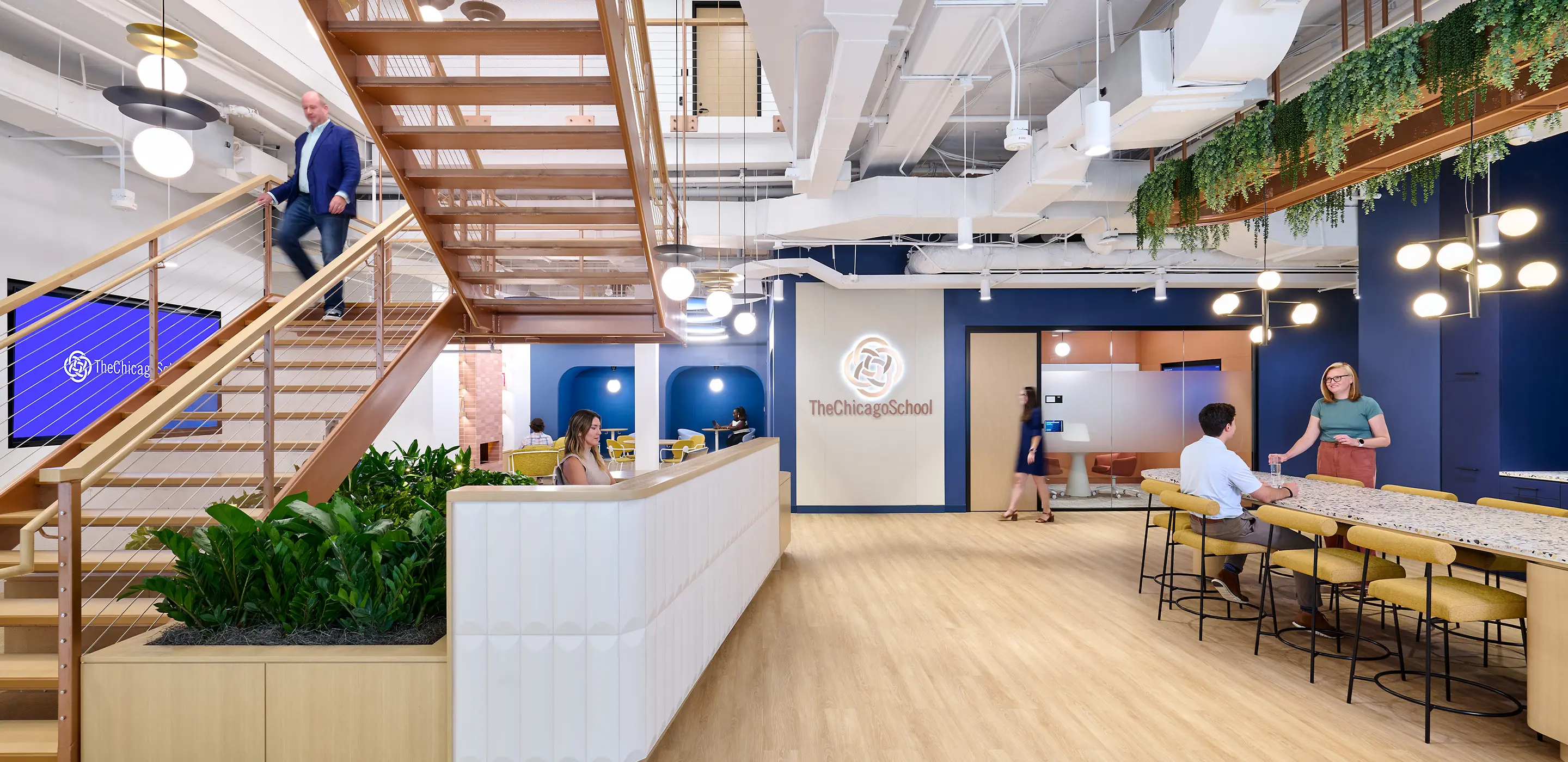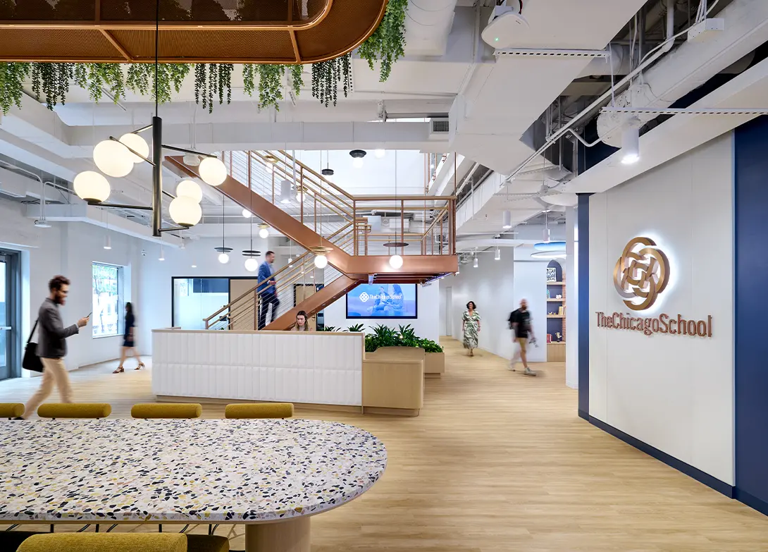 The Washington, D.C. campus stands as an environment that embodies The Chicago School’s values: a place where branded identity, integrated design, and student-centered experiences converge. With its copper-toned stair, biophilic elements, and immersive graphics, the campus makes an immediate impression, both a welcoming space for students and a proud extension of the university’s national presence.