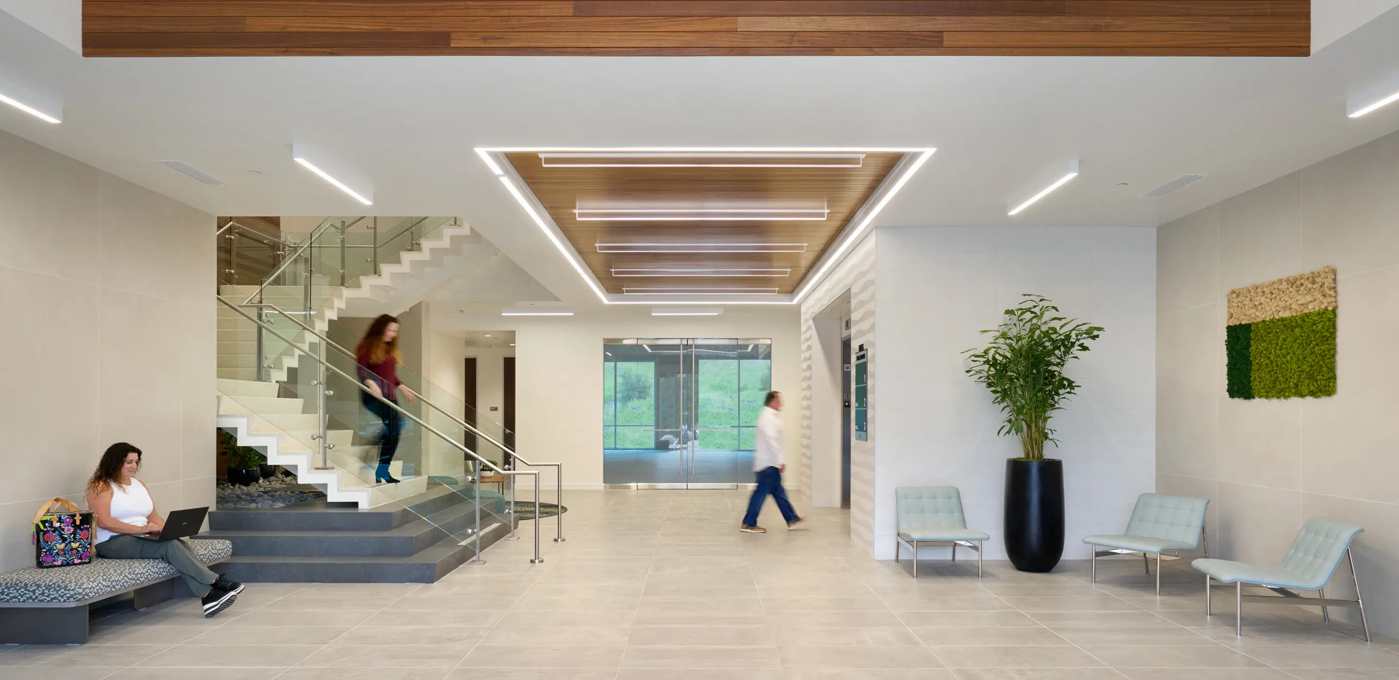 Recognizing the importance of outdoor space to workplace culture, the design incorporates landscaped terraces and patios that invite daily use. On the ground level, outdoor gathering spaces support informal meetings and moments of respite, while a third-floor patio offers expansive views of the surrounding landscape. These spaces provide tenants with opportunities to connect, recharge, and adapt their workday to different settings, reinforcing the building’s appeal to a variety of workstyles and organizational cultures.