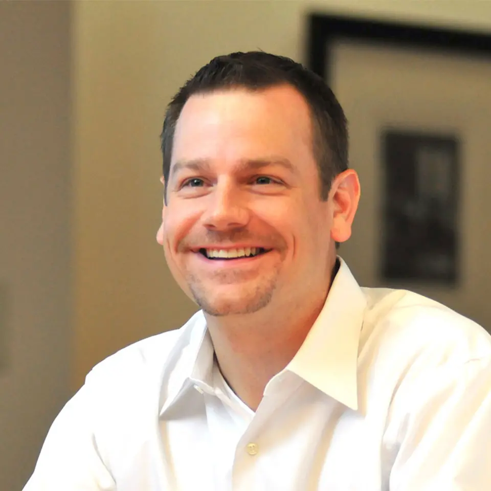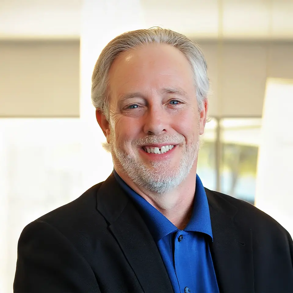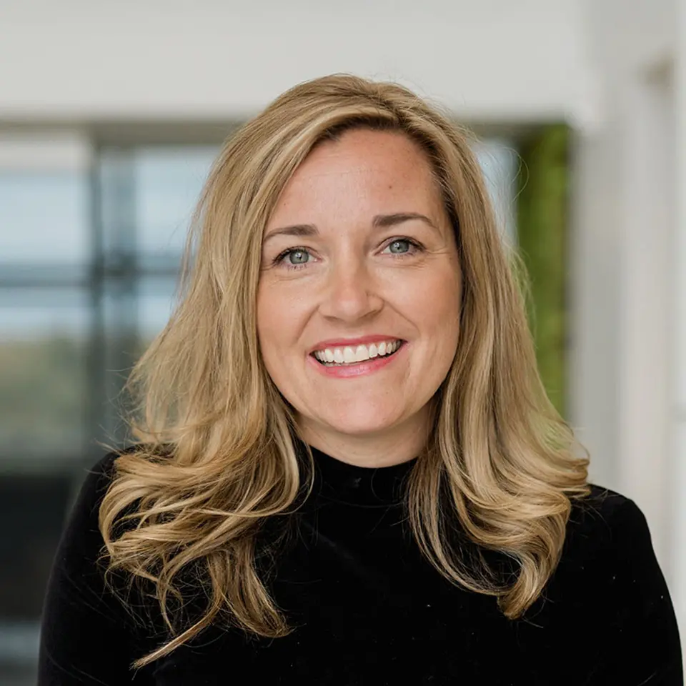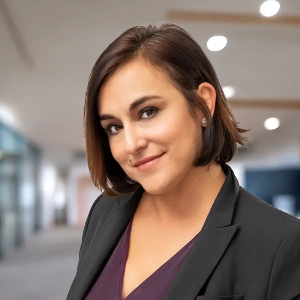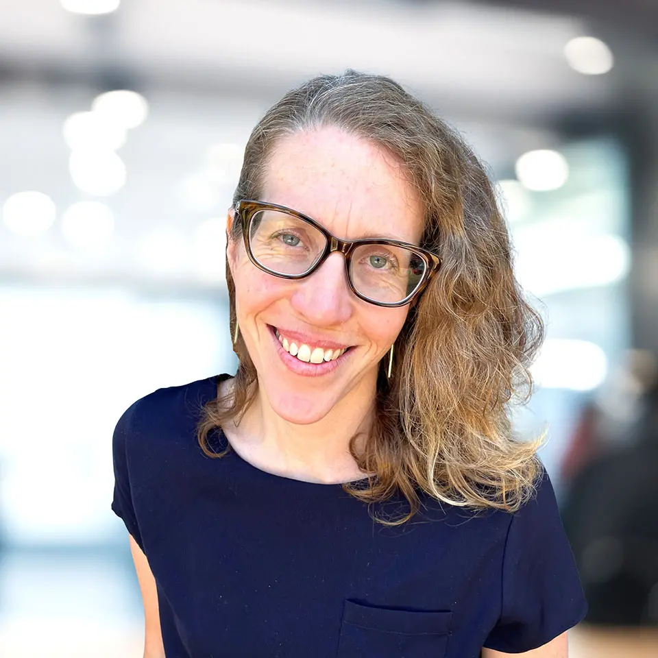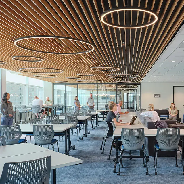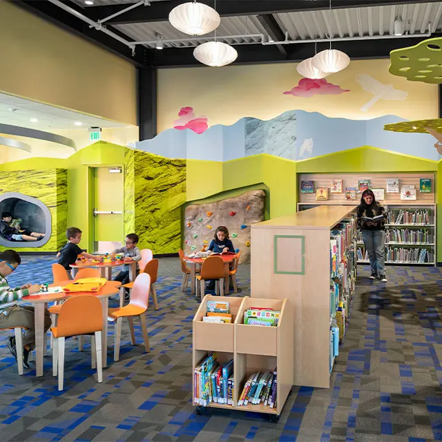 Modern brick building with large windows, people outside, greenery, and accessible parking spaces in the foreground.