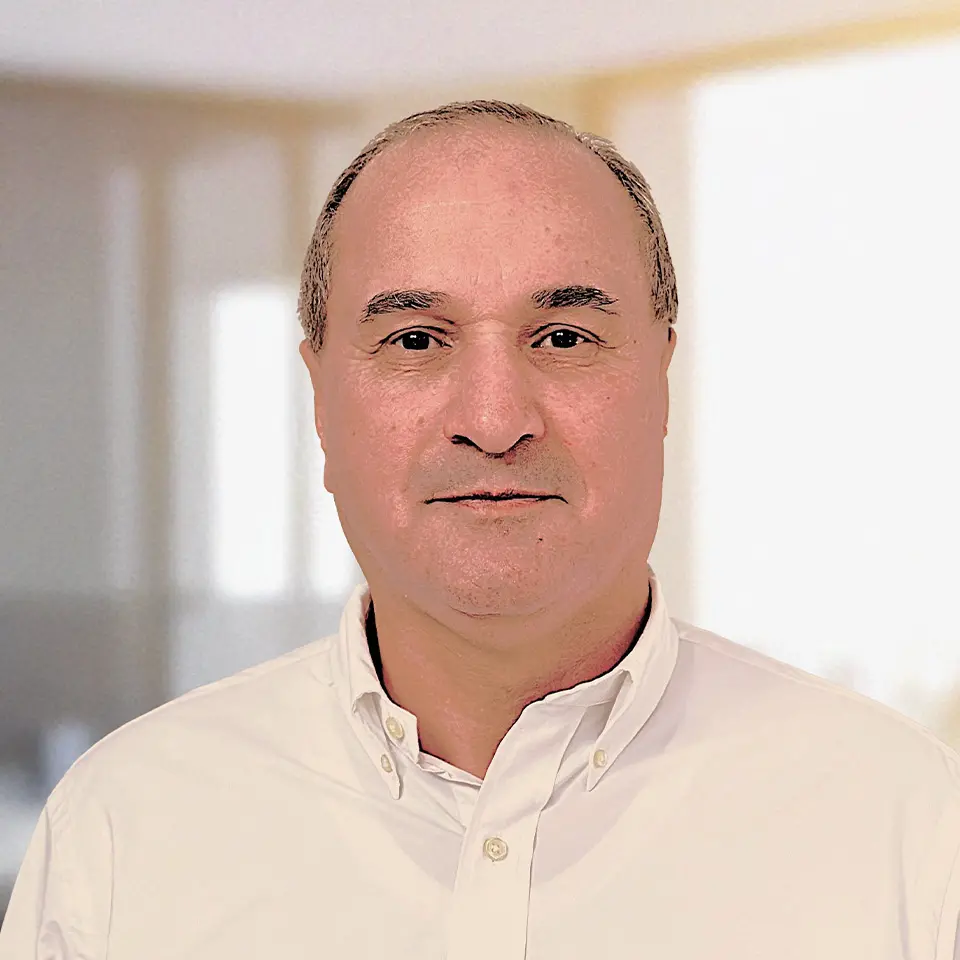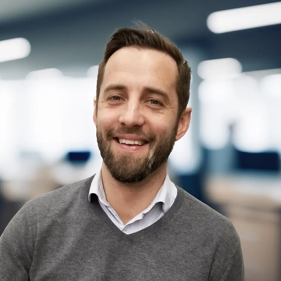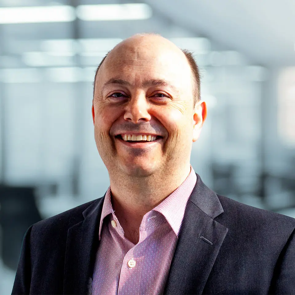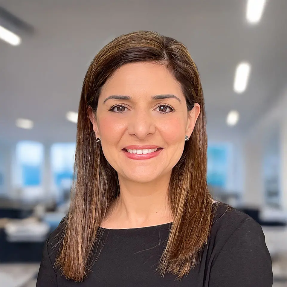 Modern six-story building with glass facade, cars parked outside, and people walking on a sunny day.