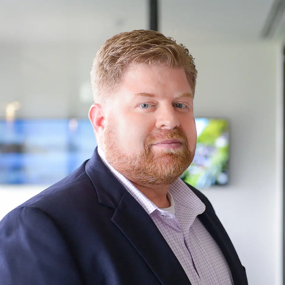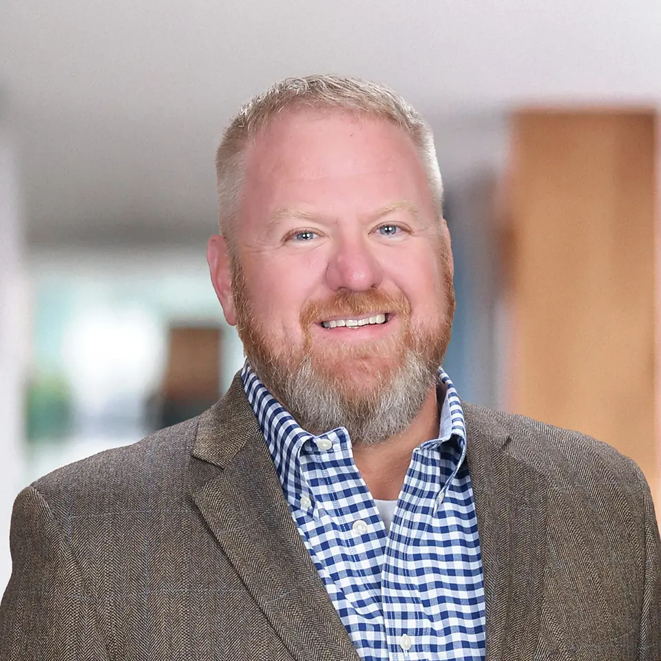 Modern apartment complex at sunset with landscaped grounds and pathways.