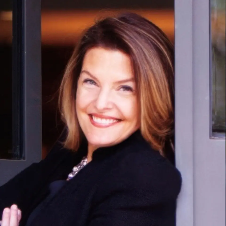 Modern communal kitchen with people conversing at island, open to patio with outdoor seating and greenery.